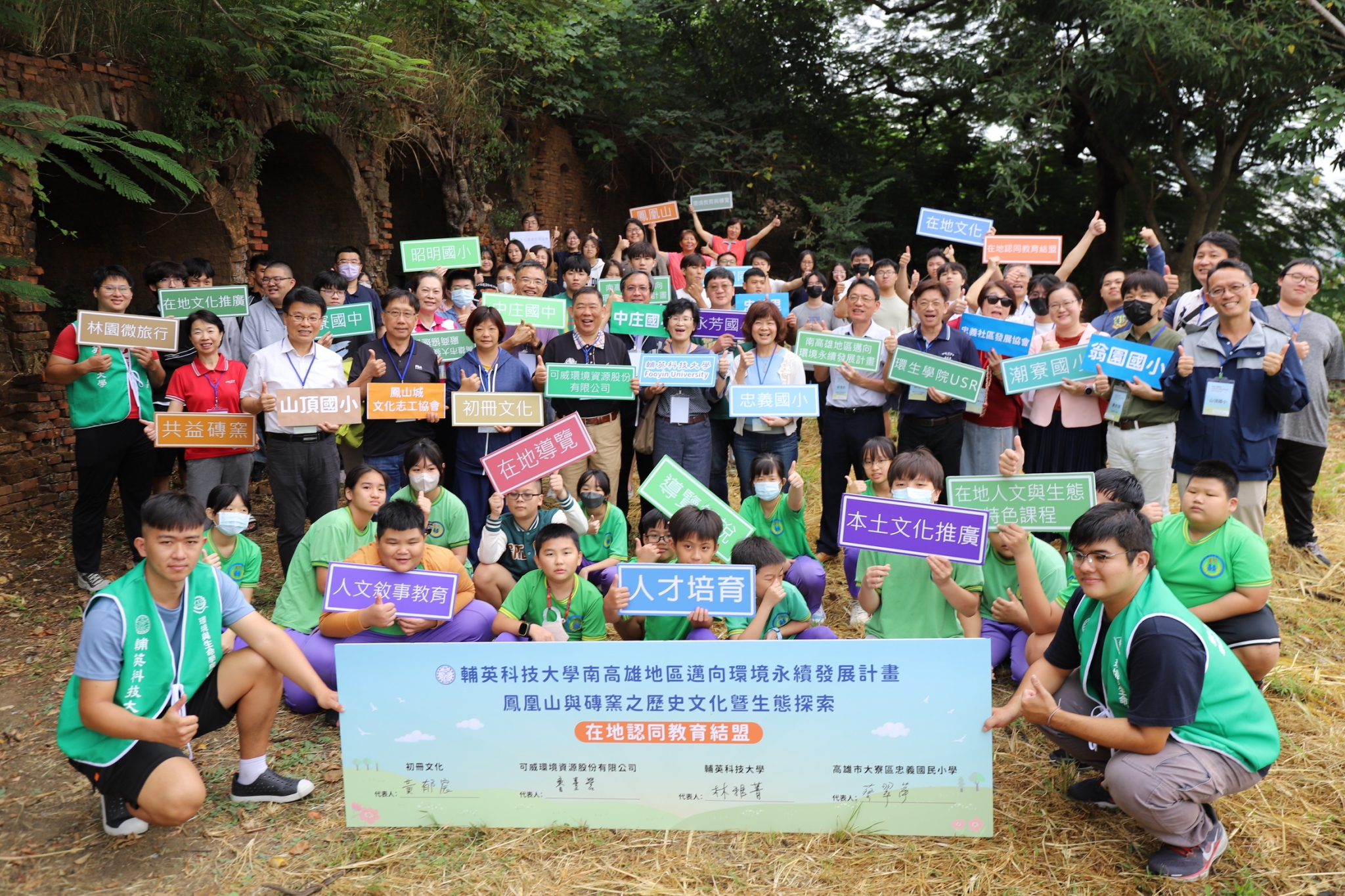 結盟儀式十日下午於忠義國小登場,由輔英科大、可威環境資源公司、忠義國小與初冊文化共同簽署,隨後由輔英學生及初冊文化擔任導覽員,領著忠義國小師生前往大寮磚窯廠及鳳凰山,進行文化與生態導覽,透過教育與行動的結合,讓師生了解在地自然與人文特色。