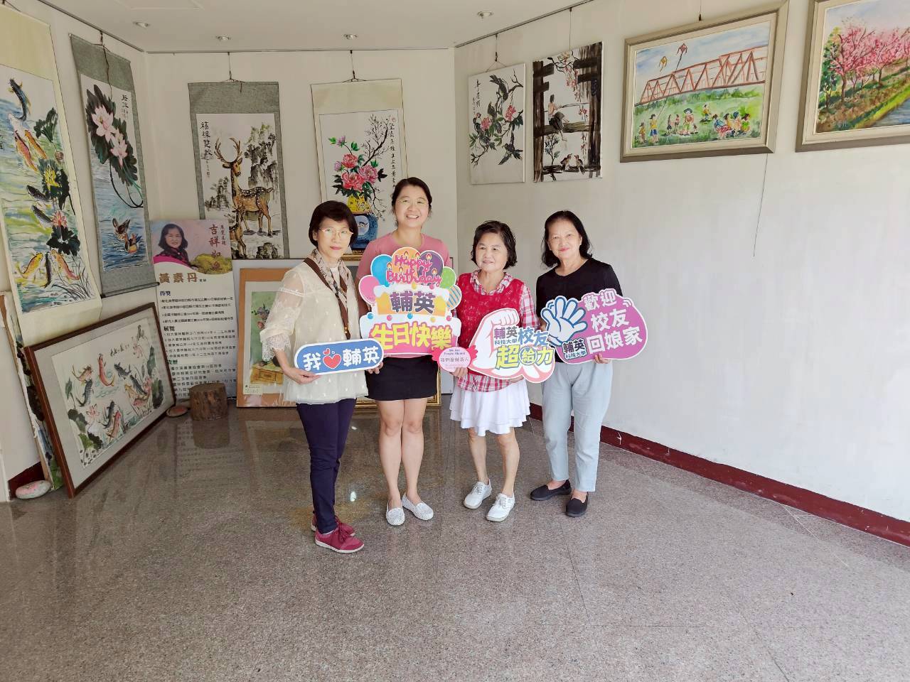 輔英校友黃素丹(右二)以線上藝文展《人比花嬌.心花怒放》為母校輔英生日獻禮。