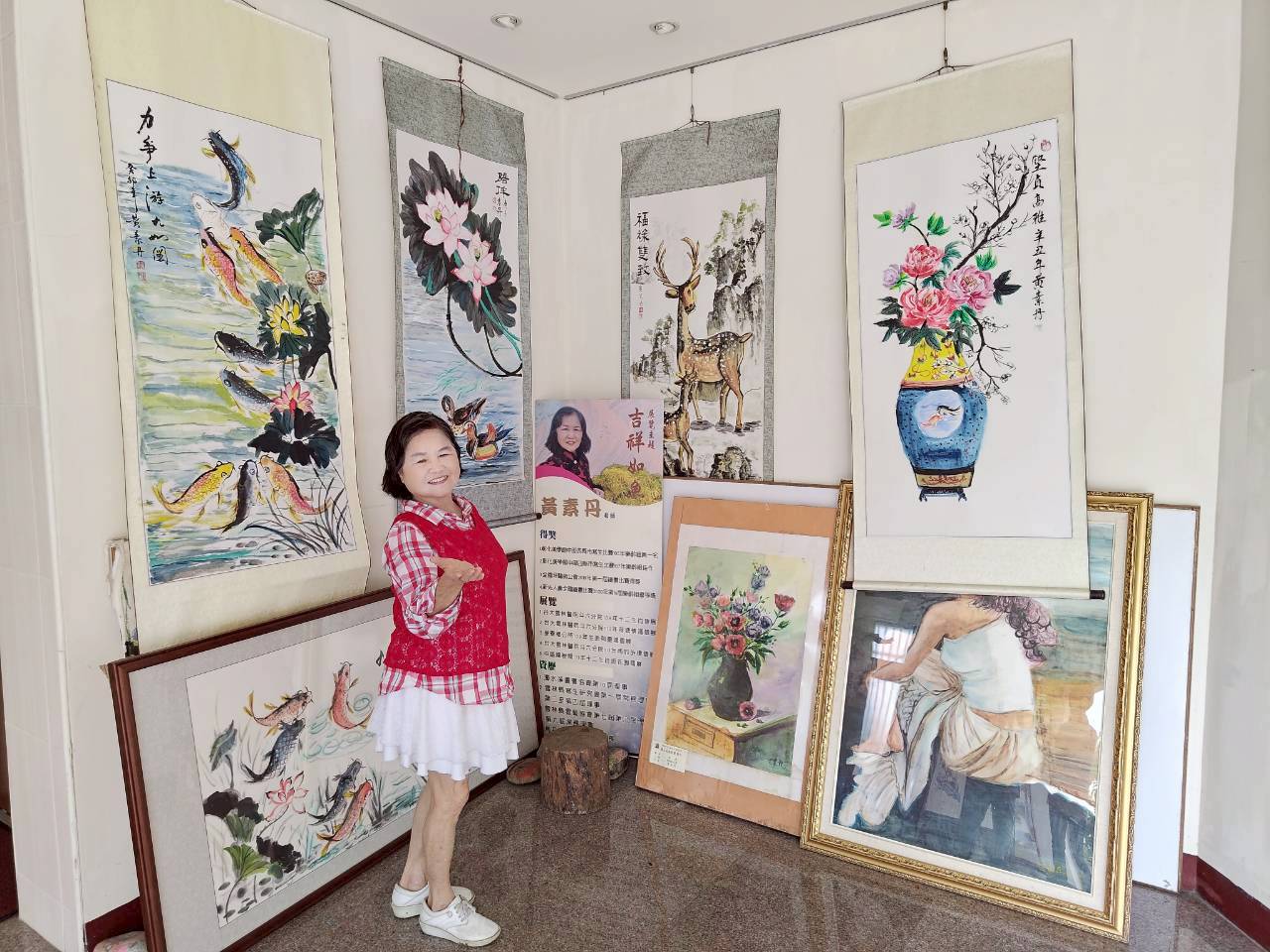 黃素丹曾任臺大醫院雲林分院護理長,50歲退休後投身創業,成立居護所與醫療器材公司。她笑說:「學畫原是為興趣,後來邀醫師、護理師、營養師、會計人員等一起學,讓藝術變成陪伴。」如今她家中設有畫室,持續創作魚、荷花與風景主題,以畫療癒人心、以藝會友。她感性地說:「輔英是我人生的起點,回來參加校慶比獲獎更有意義。」