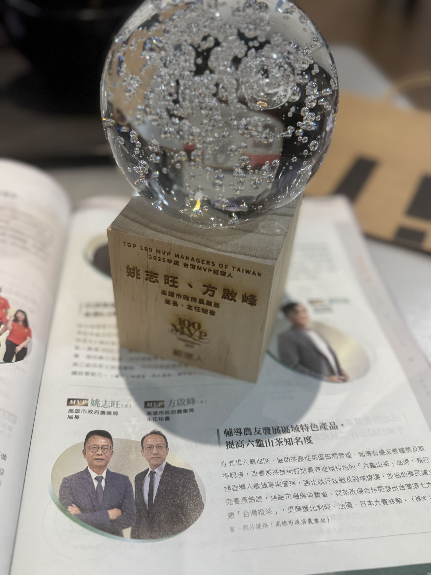 高雄市政府農業局姚志旺局長與方啟峰主任秘書以「六龜山茶產業發展與行銷」專案,榮獲《2025年第18屆100MVP經理人》大獎,頒獎典禮(114)年11月28日在台北遠東香格里拉飯店盛大舉行,農業局突破傳統公部門運作模式,將「敏捷管理」導入農村再生與產業升級,使六龜原生山茶從八八風災後的重建、走向品牌化,再一路踏上國際競賽舞台,成功翻轉地方產業命運,成為最受矚目的公部門典範專案之一,本次典禮亦邀集產官學界代表共同出席,見證高雄市在農業治理與產業創新上的嶄新突破,展現公部門以系統化管理推動地方產業升級的能量。