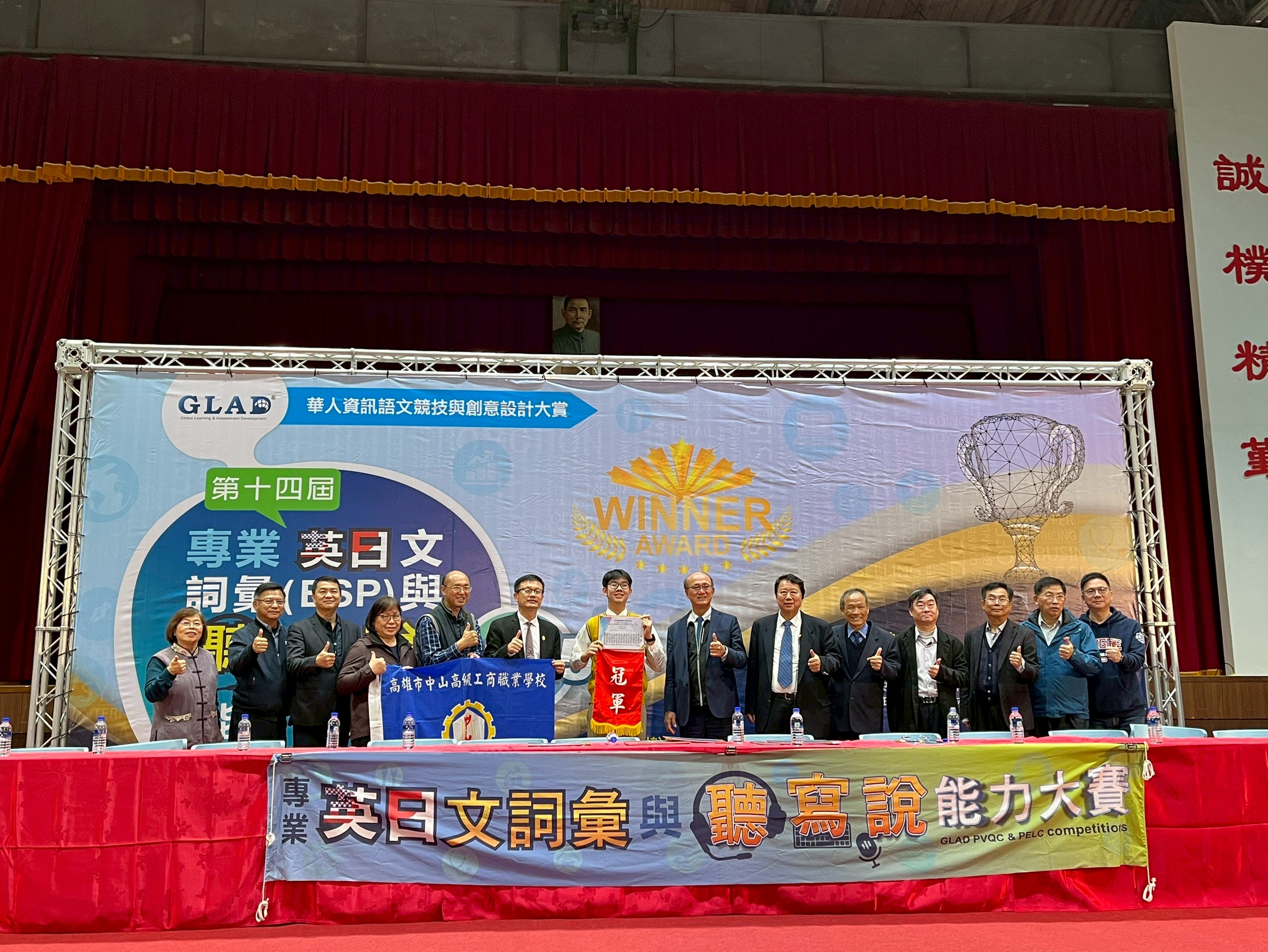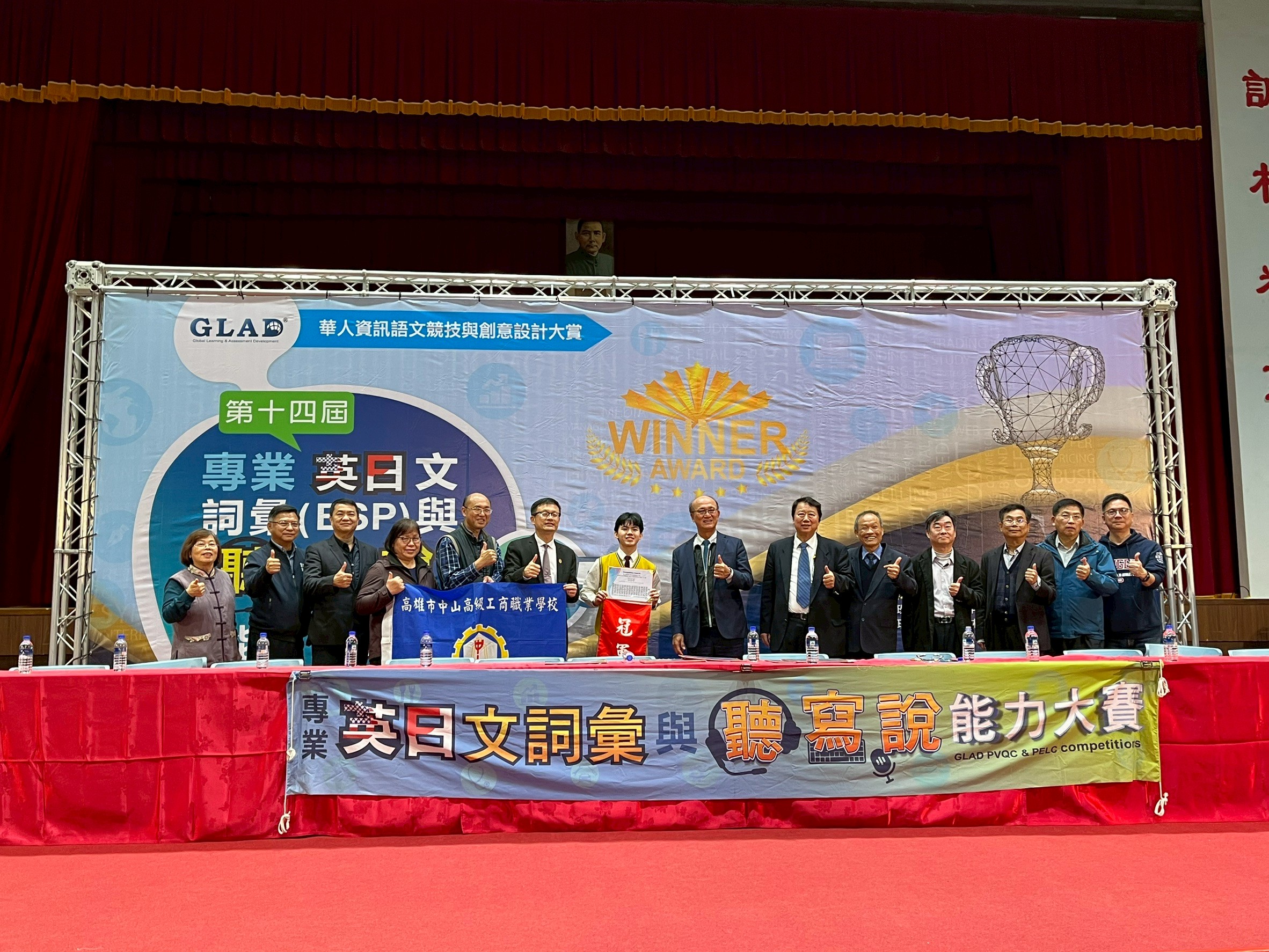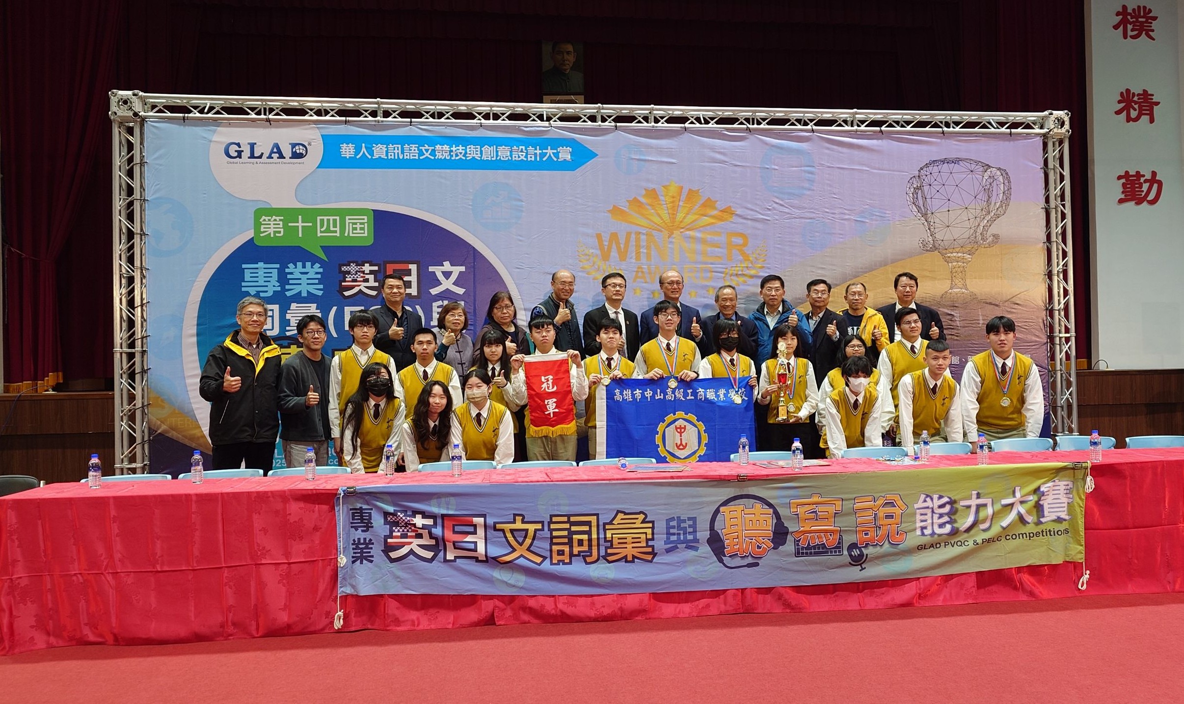 【本報記者陳明成高雄報導】中山工商參加第14屆「專業英日文(ESP)詞彙與聽寫說能力全國總決賽」,位選手勇奪七冠軍、六亞軍、三季軍與金腦獎,其中八位還獲得滿分,不僅稱霸賽場也再次寫下校史新高。