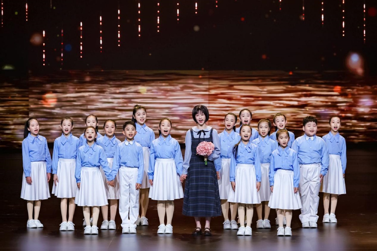 情景音畫《團圓》以福州籍英雄吳石與女兒的故事為切口,用一張舊船票、一幅書法作品“家”串聯起歲月記憶。舞臺上,16歲的吳學成哼著“月光光,照池塘”的福建童謠,從對父親“拆散家庭”的不解,到讀懂“家是千萬同胞與祖國”的深意,最終明白父親“為什麼寧願背負這份遺憾,也不肯回頭”。“走丟了不要怕呀,會重逢,會重逢……”,捧著象徵“團圓”的繡球花的海之聲少年唱隊緩緩登場,瑩瑩燈球降下——閩人浩蕩的家國情懷,在這一刻化作千萬盞燈火,照亮英雄們回家的路。