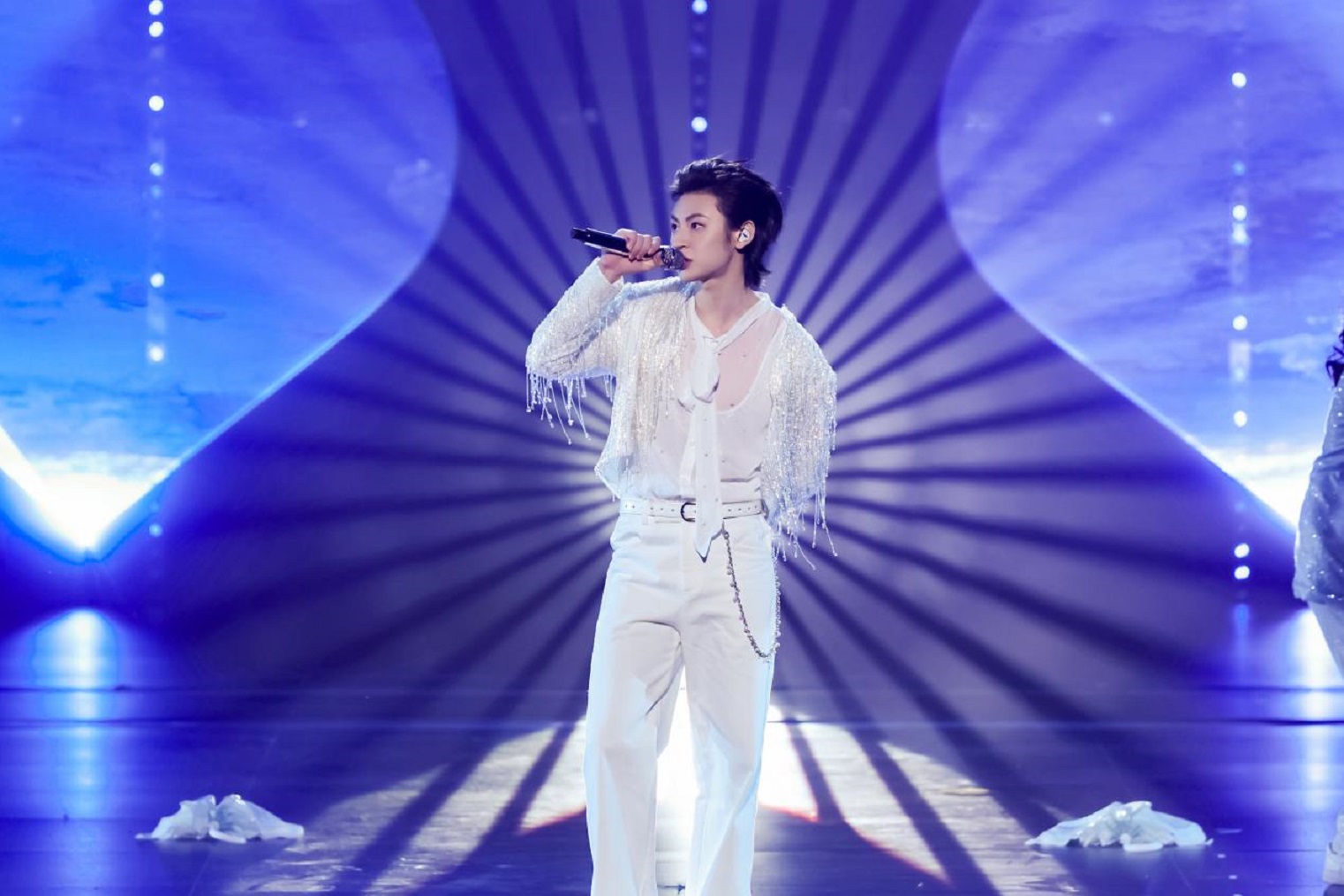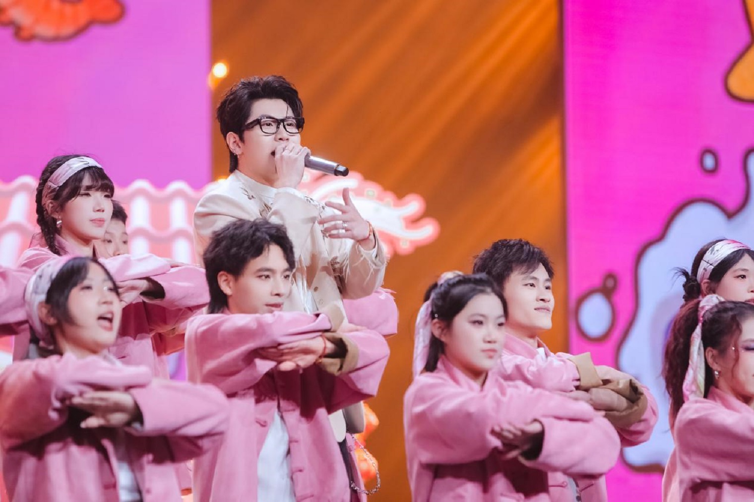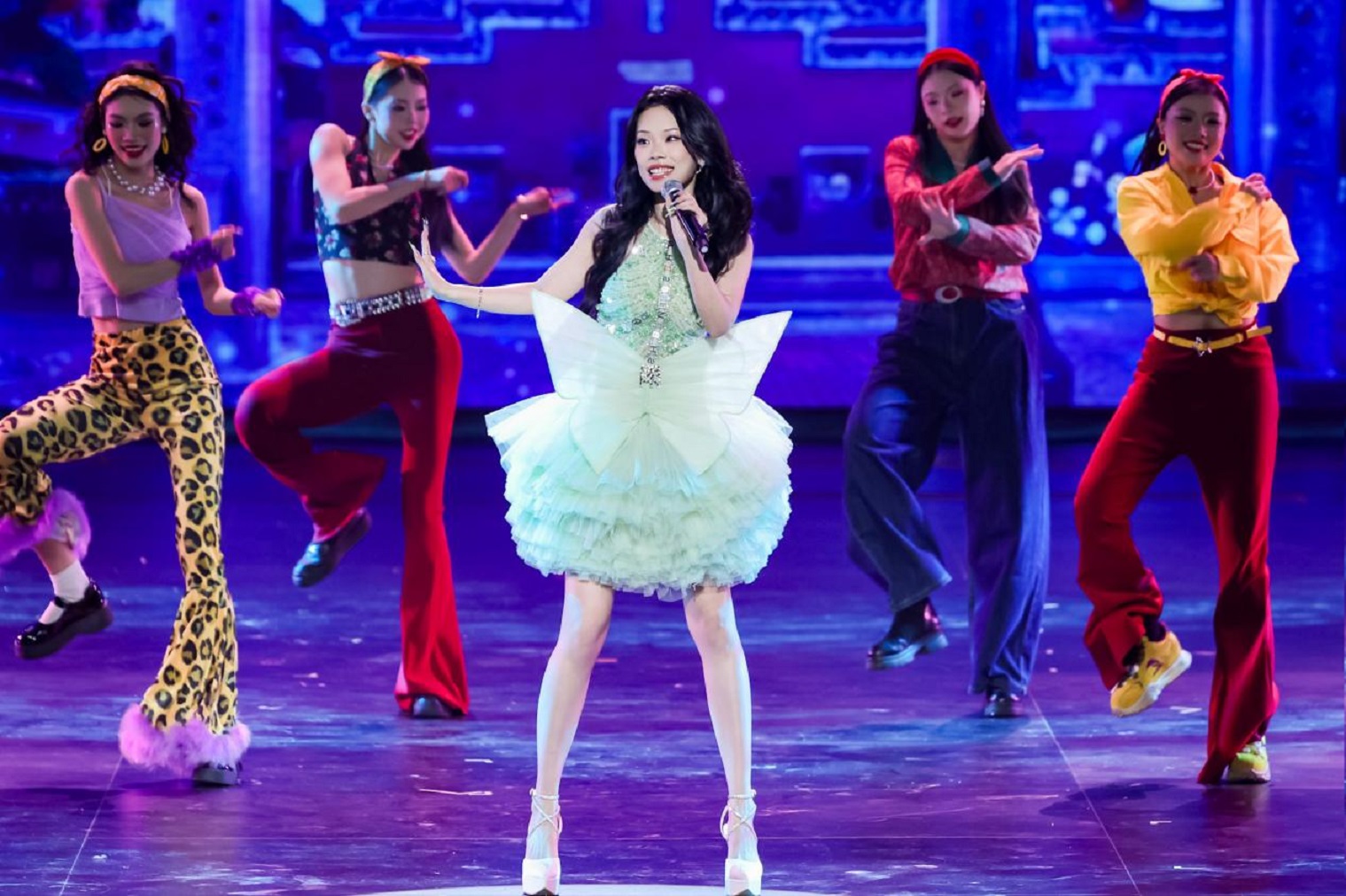 小鬼-王琳凱領銜的歌舞《Raining》中,燈光隨律動變幻成漫天雨絲,將青年人的自由律動轉化為可視的藝術張力;暖黃燈光、霓虹招牌、老物件陳設等共同營造的復古舞臺上,萬妮達與薑育恒連袂獻唱《雕刻時光的人》,質感金嗓瞬間將觀眾拉回上世紀八十年代,喚醒兩岸共同的文化記憶;《潮生東方》裡,隨著徐均朔清越澎湃的歌聲,模擬鯨魚浮空飛行器遨遊在“深海奇景”中,呈現福建“向海而生、開拓進取”的壯闊圖景。