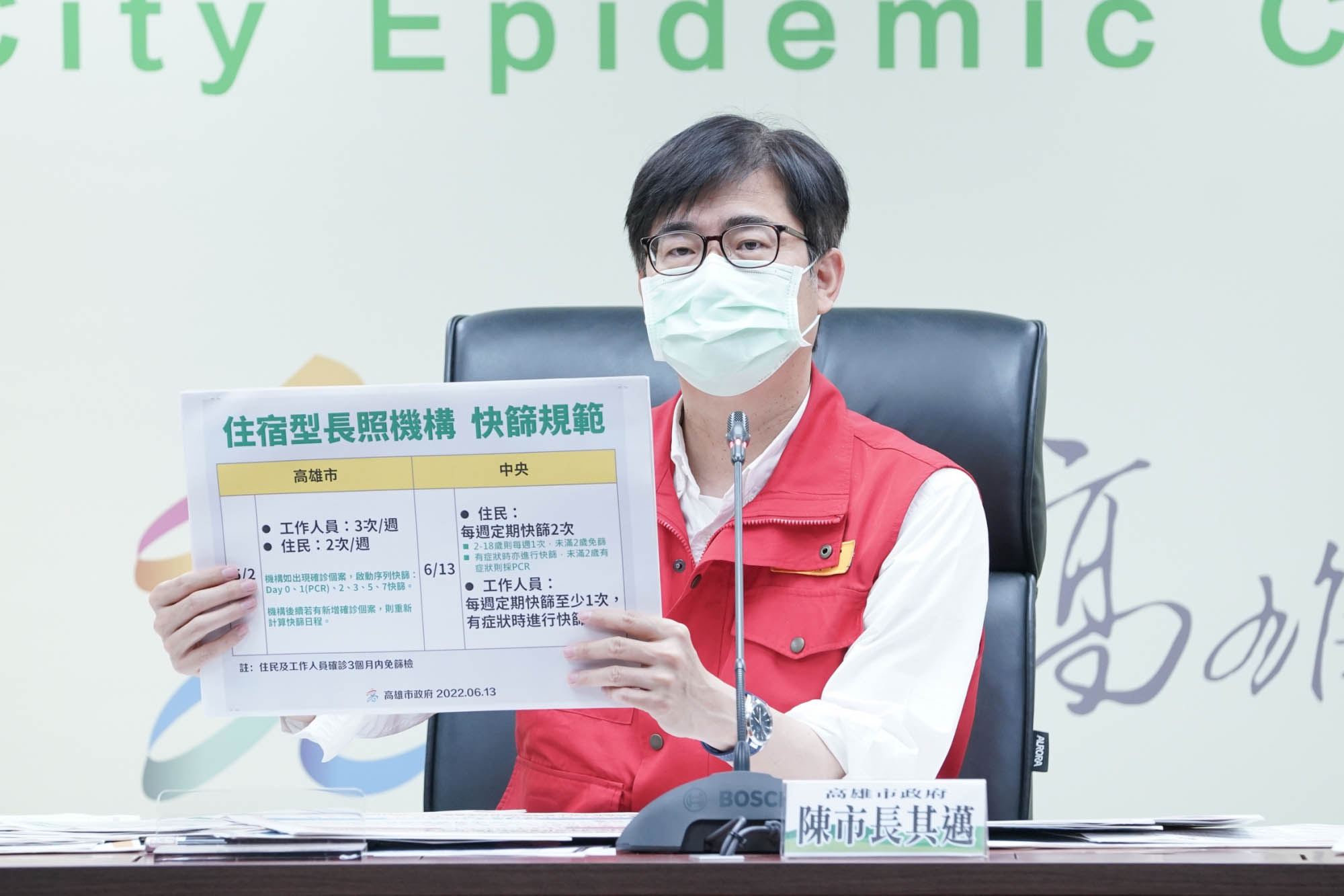 今天中央也公布6月中旬至7月底止,住宿型長照機構公費快篩措施,包括住民每週定期快篩2次,檢出陽性個案立即請專責醫療院所視訊診療並投藥,工作人員每週定期快篩至少1次,陳其邁表示,高雄自5月起,已經施行相關措施一段期間,工作人員每週快篩3次、住民為每週2次,高雄將維持現行較強強度之規範實施。而針對居家長照個案到宅接種,如行動不便或臥床等居家照護對象,可撥打1966專線,或透過區公所登記申請,由醫護人員到宅施打疫苗。