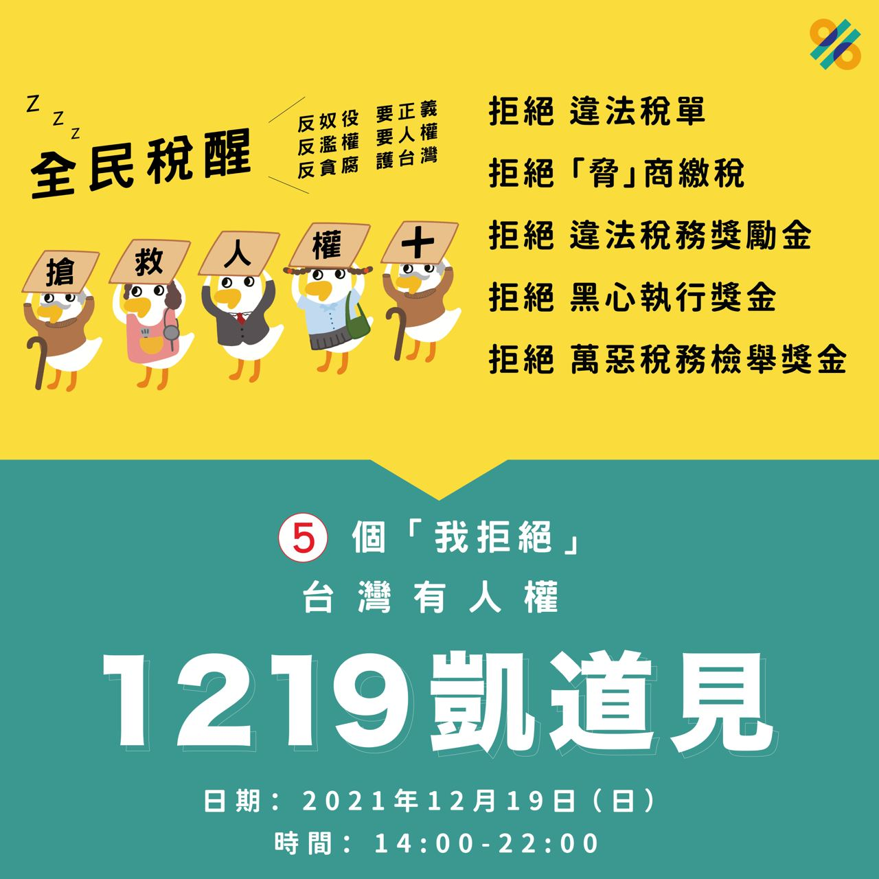 主辦單位表示,遊行和晚會宣講的訴求,還有「全民稅醒 搶救人權Plus」,內容為反奴役,要正義、反濫權,要人權、反貪腐,護台灣;更訴求5個「我拒絕」 ,拒絕違法稅單、拒絕脅商繳稅、拒絕違法稅務獎勵金、拒絕黑心執行獎金、拒絕萬惡稅務檢舉獎金,希望民眾一起支持「廢獎金、救冤案、護人權」連署,詳情請上https://fightforfair.tax/ 網站了解。