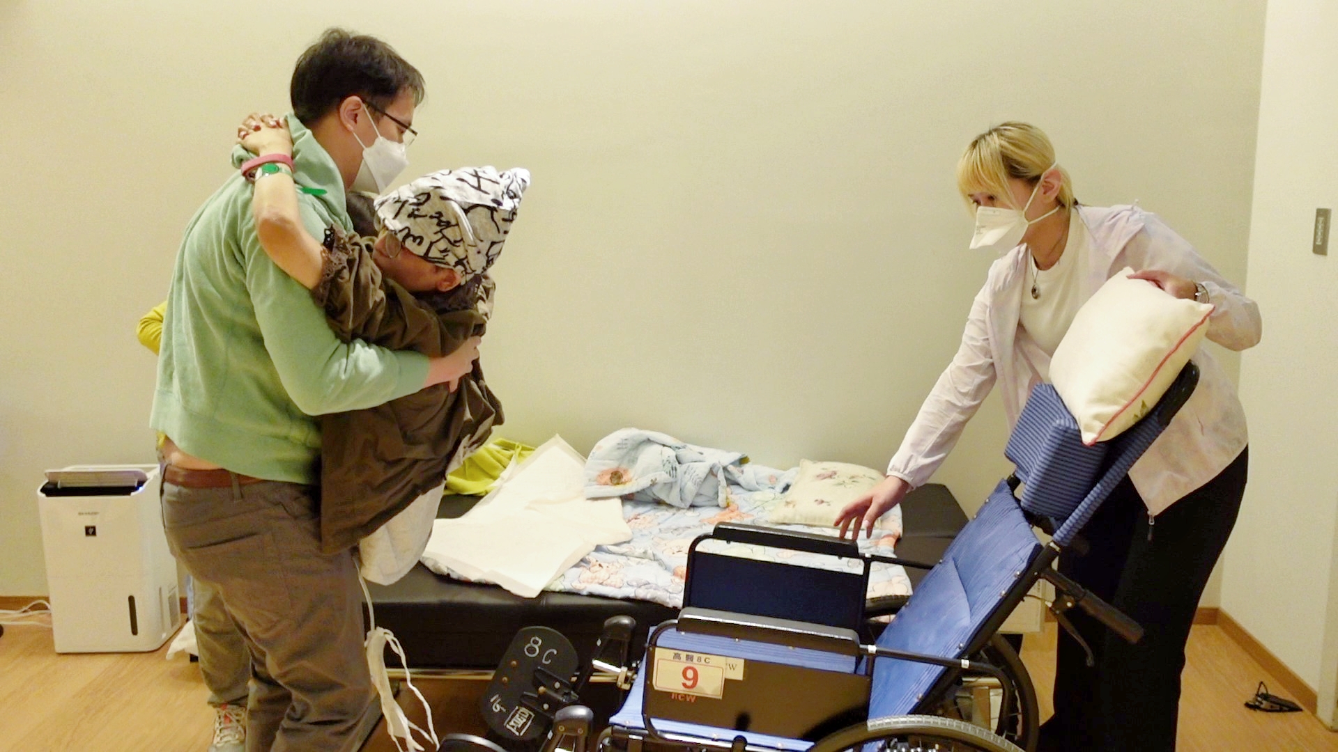 .巫承哲醫師(左)抱著佳佳坐上輪椅準備進場。