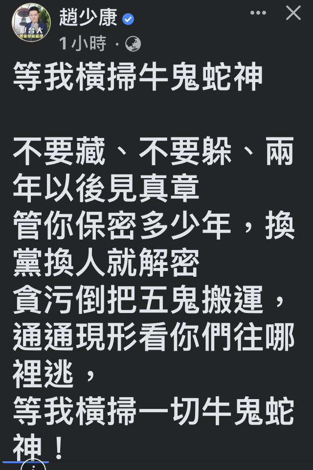 趙少康要大家等他二年後橫掃牛鬼蛇神,強調貪污者不要藏、不要躲、兩年以後見真章,管你保密多少年,換黨換人就解密,貪污倒把五鬼搬運,通通現形看你們往哪裡逃,等他橫掃一切牛鬼蛇神!