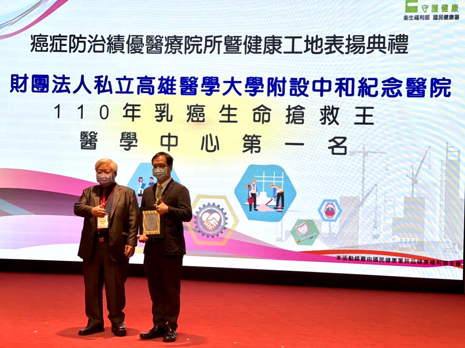 高雄醫學大學附設中和紀念醫院在109-110年共篩檢11,693人,陽性個案數共1,394人,在陽性個案中發現癌症數高達236人,0-1期者共52人,早期發現率達22%。卓越的表現榮獲國民健康署頒發「109年、110年乳癌生命搶救王醫學中心」,並於13日假臺北舉辦頒獎典禮。