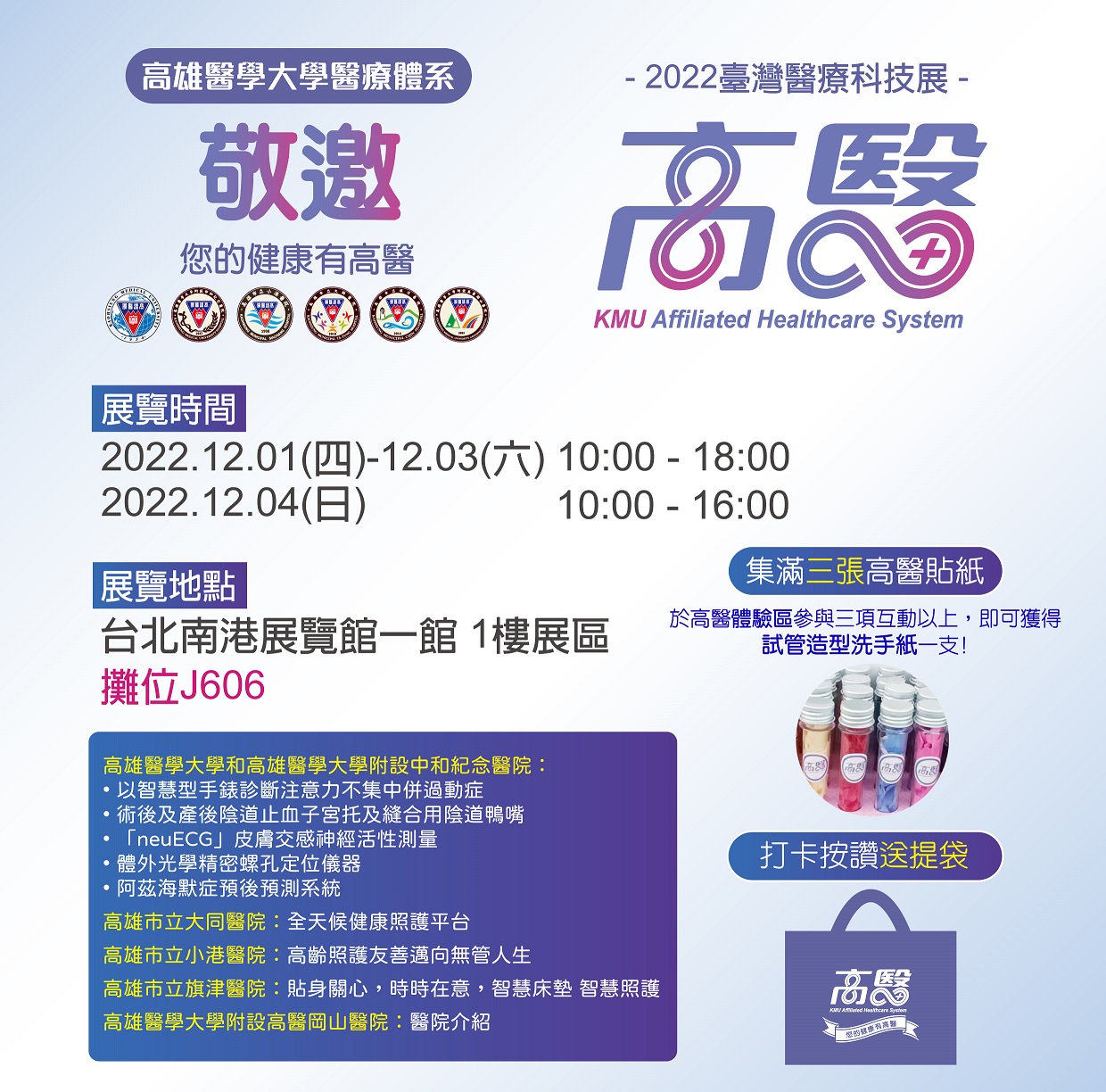 2022臺灣醫療科技展將於12月1日起至4日,在臺北南港展覽館一館1F登場,守護南臺灣健康的靠山—高雄醫學大學醫療體系,包括高雄醫學大學、附設中和紀念醫院、高雄市立小港醫院、大同醫院、旗津醫院及高醫岡山醫院籌設營運處等一校五院,將聯袂參與這場盛大的健康派對,展出攤位設在J606,以「您的健康有高醫」為參展主題,展示多項醫療創新技術及AI智能,且每一天均有專題演講,歡迎民眾前往參觀、體驗。