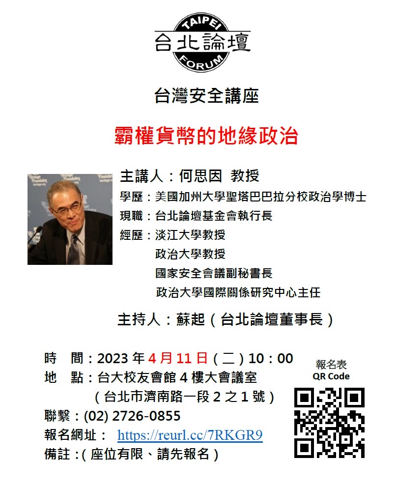 台北論壇四月份〈台北論壇講座〉訂於4月11日(星期二)上午10:00假台大校友會館四樓大會議室(台北市濟南路一段2之1號),由何思因執行長以《霸權貨幣的地緣政治》為題發表演說。歡迎各位師長、先進報名參加。報名網址如下: