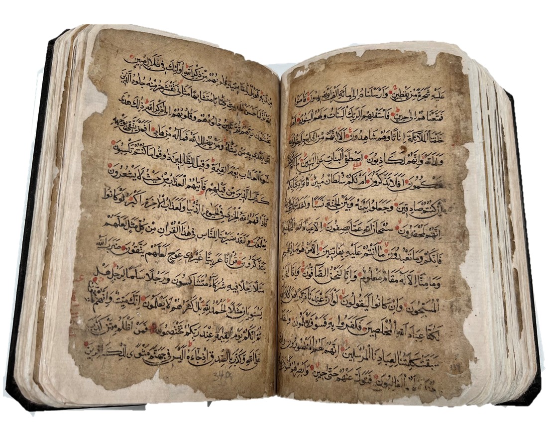 該本《古蘭經》有火燒、泥土的痕跡,國立臺灣圖書館徐美文博士推測它歷經過戰爭與地震,書頁裡有疑似血跡、泥土、花瓣、男性毛髮、植物種子,最多的是還在侵蝕書本的菸甲蟲。徐美文博士接下這個任務時其實心裡很忐忑,後來評估書本的紙張是用「從唐朝傳到大食的造紙技術所抄製的『麻紙』」,就比較有信心。