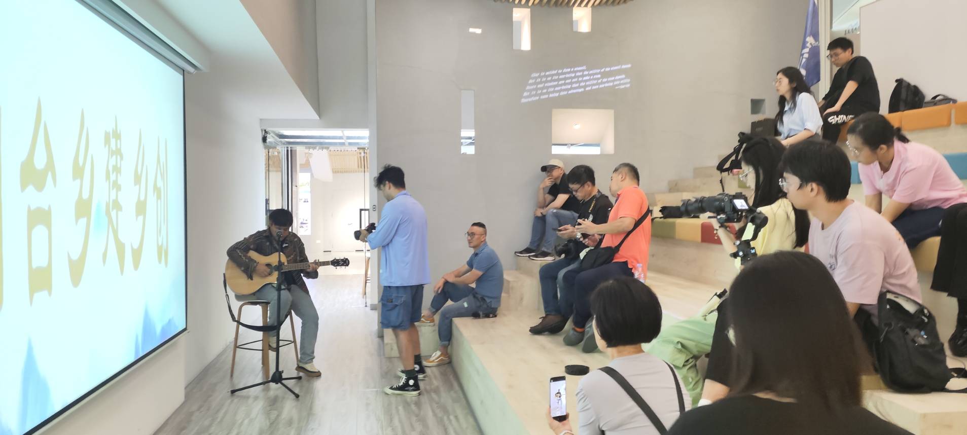 「融行八閩」兩岸媒體採訪團活動的尾聲,臺青賴賴獻上閩南語原創歌曲,表達幾天來參觀福建的感受,現場的兩岸媒體人也跟著音樂節奏拍手歡呼。