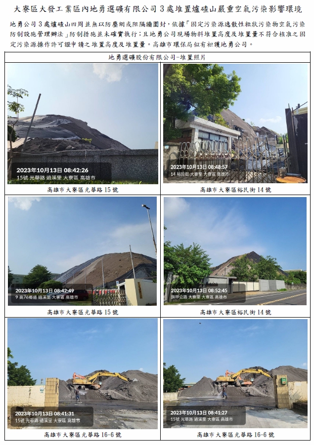環保局空汙與噪音管理科表示,接獲檢舉案,10月27日已前往地勇公司,地勇公司雖沒有依規定覆蓋,但有噴防止飛揚的噴劑,減少粉塵,已限期改善,最近會再前往,未達要求即依法告發。