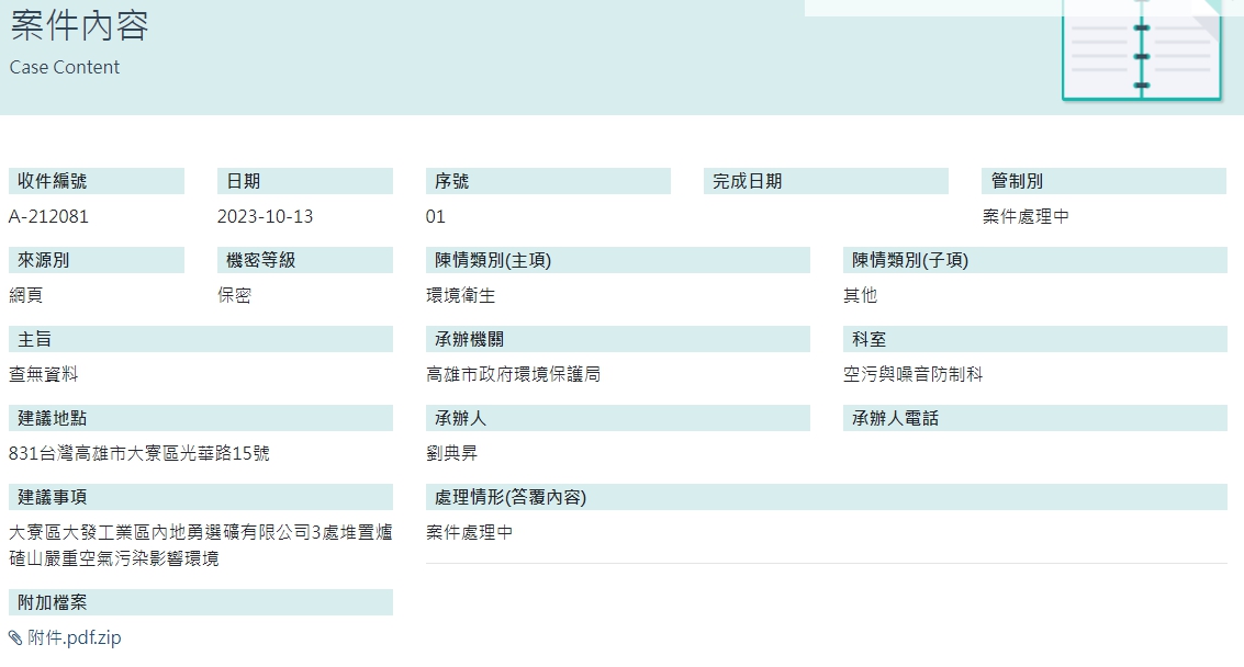 檢舉人指出,同樣在大寮區大發工業區儲存爐渣,中聯資源可以築高牆,依法覆蓋,為何地勇可以任意在農地、工業區沒有妥善管理儲存,嚴重危害公共安全和汙染環境,要求環保局依法辦理,保障環境和公共安全。