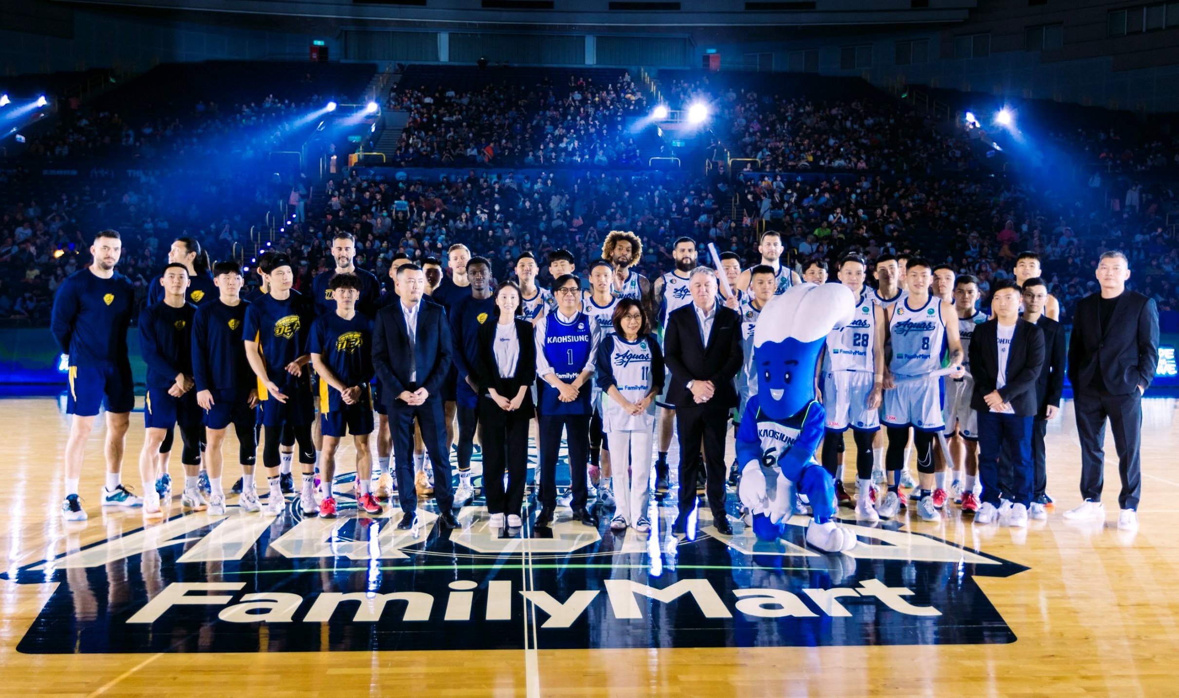 高雄全家海神職業籃球隊2023-24球季主場開幕四連戰於今(2)日高雄巨蛋登場,首戰新北中信特攻隊,陳其邁市長穿上1號球衣,與議長康裕成和球員們擊掌互動激勵士氣,並為開幕首戰開球。賽事最後也由邱子軒投出逆轉絕殺三分球拿下賽季首勝。
