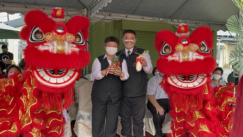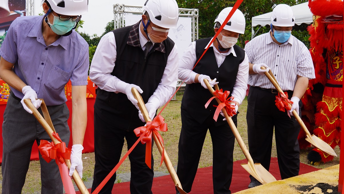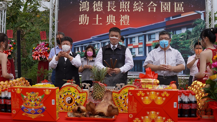 高雄市大樹區鴻德長照綜合園區9日上午動土,鴻德生命事業總經理陳岷營獻上象徵吉祥如意的「旺來」和「好彩頭」,五互集團陳秋白總裁、陳易鴻執行長等貴賓進行開工祝禱、動土儀式及祭祀祈福活動,共同祈求工程能如期如質完成。