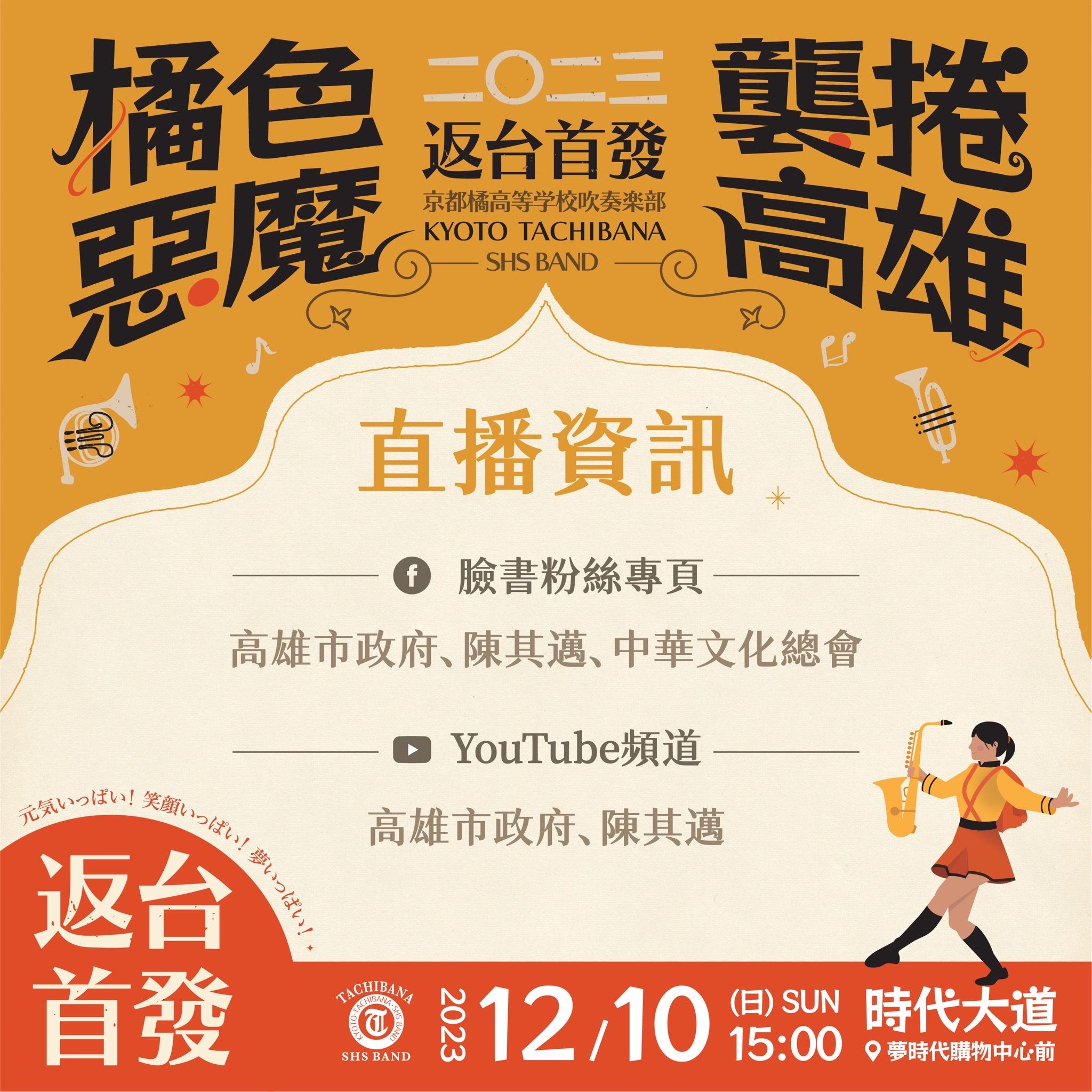 「橘色惡魔」日本京都橘高校吹奏樂部與高雄五所高中職12月10日將在高雄演出,時代大道周邊進行交通管制,高雄市政府呼籲民眾搭乘捷運、步行前往現場。因應民眾熱情迴響,高雄市政府將在活動現場設置「同步直播區」架設500吋大型螢幕,也在網路平台同步進行多元視角直播。市政府特別設計「橘色惡魔襲捲高雄」主視覺應援手幅,提供民眾自行列印。