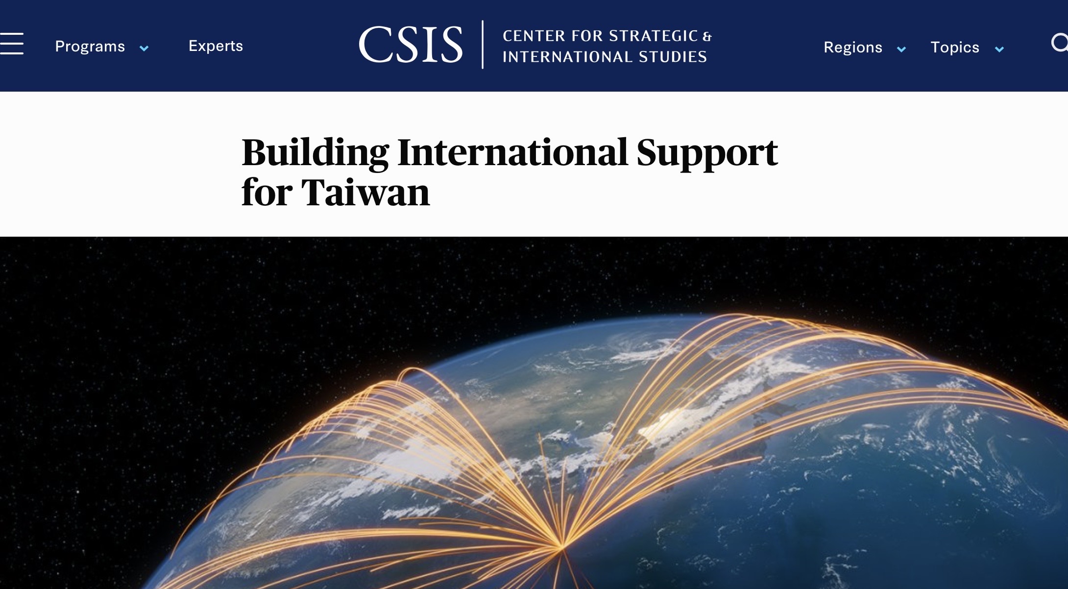 https://www.csis.org/analysis/building-international-support-taiwan?fbclid=IwAR2lxGJXYOjs-uwie_HJnIjpH_6uoaE9HUPK1G2sbjwLZw6jI8ZEDCbjd7A_aem_AYZCxZf0h05x2z9gstimjXbIwM4c0EKP1aNjf4uFmPx1MpPqlAykw6KTEcl579ozWVk