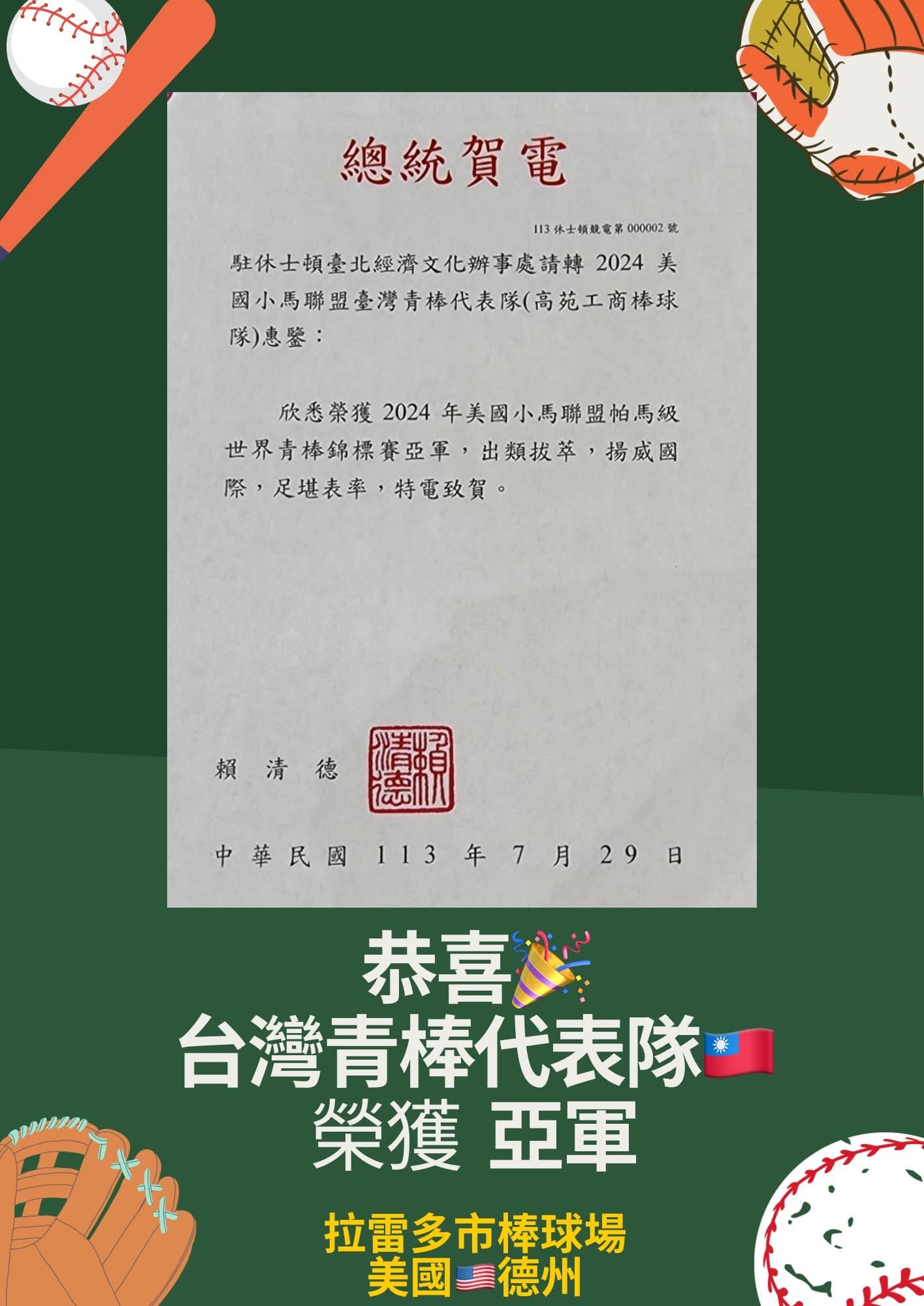 賴清德總統、蕭美琴副總統在第一時間寄來賀電,余政憲感謝高雄市政府、高雄市議會、企業界朋友支持出國龐大經費。同時感謝台灣駐休斯頓代表處蕭伊芳處長、楊淑雅組長,還有拉多雷市劉大姐等很多僑胞遠從達拉斯、休斯頓…各地開車7小時來球場為球隊加油。