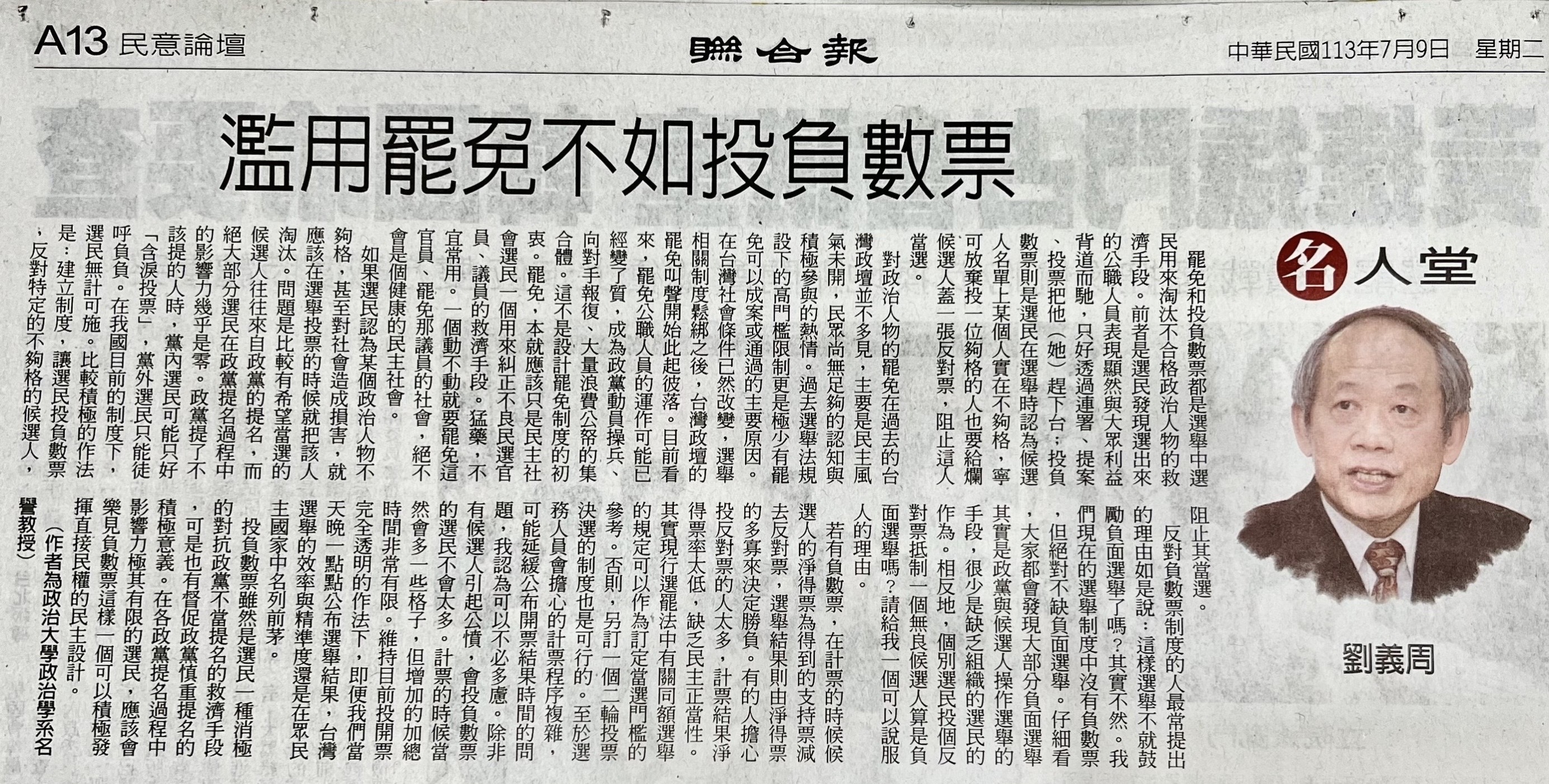 中選會前主委劉義周:濫用罷免倒不如選舉時投負數票