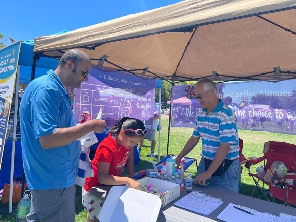 負數票協會張天鷞前理事長在美國加州小鎮的園遊會活動擺攤來介紹負數票理念。