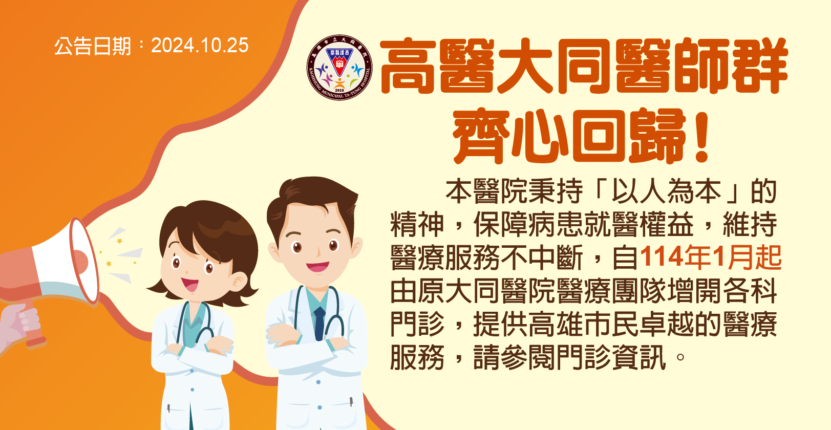 高雄醫學大學自2009年接手經營大同醫院以來,已服務超過820萬人次門急診病患,這些年來我們在急重症醫療與心血管疾病治療累積了豐碩的成果,獲得市民的高度信賴。在此交接之際,各界都收到不少民眾詢問,目前於大同醫院服務之醫師未來的門診規劃,為了讓民眾能及早安排就醫規劃,高醫已將兩百位目前於大同醫院服務之專任與支援醫師2025年1月的門診資訊完整於高醫體系各醫院官網公告,民眾可隨時下載或於線上查閱。而大同醫院醫師歸建後,在體系醫院每週將有539診次以上之服務,並將視民眾需求滾動式調整並增加門診診次,診次安排以高醫體系各醫院做整體規劃,以就近照顧廣大市民,讓民眾能夠便捷獲得妥善的醫療照顧。