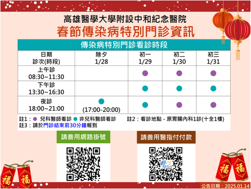 農曆春節假期將至,高雄醫學大學附設中和紀念醫院春節期間,急診、血液透析、住院照常服務;門診及檢查自1/28 (除夕)至1/31 (初三)暫停,2/1 (初四)恢復正常運作;另為兼顧農曆春節期間傳染病病人就醫需求及急重症醫療品質,於1/28(除夕)晚間至1/31(初三)開設傳染病特別門診,如有需求的民眾可上網預約,提醒民眾進入院區建議配戴口罩。