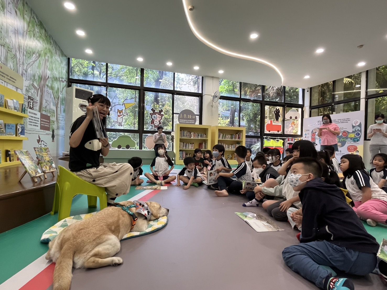 除了校園宣導外,動保處還結合好「伴」友善動物空間,由犬、貓擔任助教,不定期舉辦Animal Book Corner社區飼主責任教育宣導,期望能創造更多的「毛孩幸福家庭」。今日動保處與高雄市立圖書館新興民眾閱覽室合作,邀請故事媽媽和書僮犬Link進駐,現場擠滿學童仔細聽著「我家附近的流浪狗」,看看大家符不符合養狗的資格,也為書僮犬念上一段故事。高雄市立圖書館新興民眾閱覽室是本市第一座以寵物陪伴為主題特色的圖書館,同時也是擁有二根骨頭認證的好伴空間,透過閱讀與導讀活動,讓大人與小孩一同學習如何正確善待動物生命,並營造友善動物生命教育之學習氛圍。
