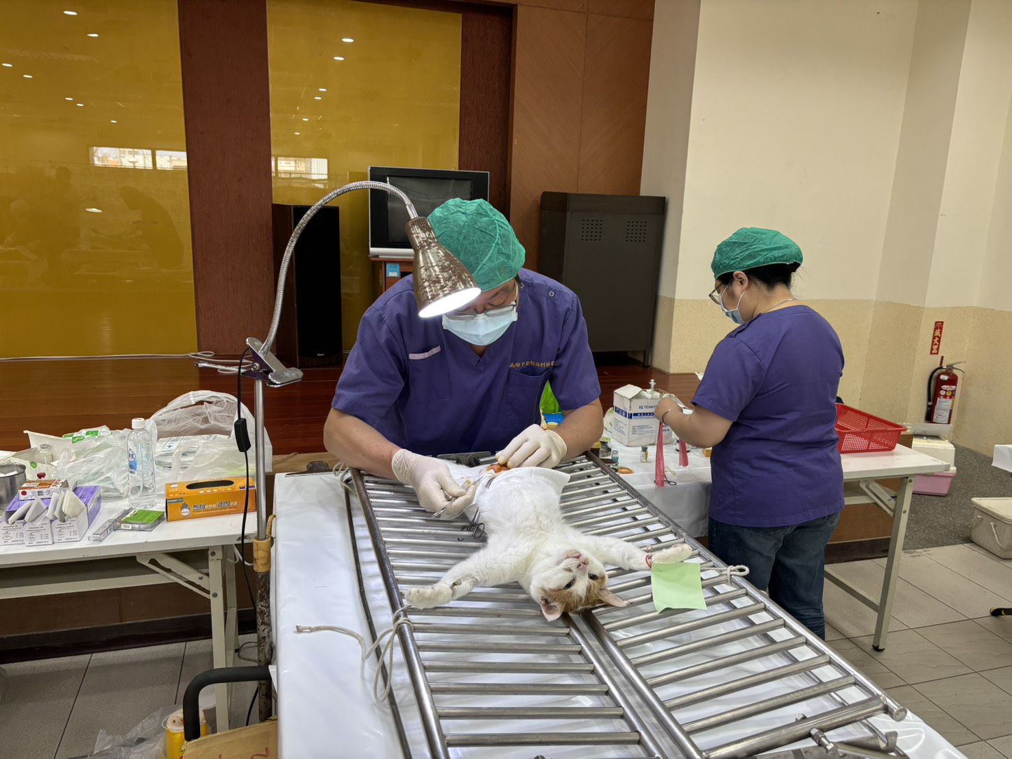 現場許多飼主提著寵物外出籠,籠裡的貓咪張著圓滾滾無辜的雙眼,觀察著四周的動靜。為避免身手靈巧的貓咪逃脫,在前置作業時,獸醫師協助飼主將貓咪一隻隻裝進具保定用途袋中,準備麻醉及手術。