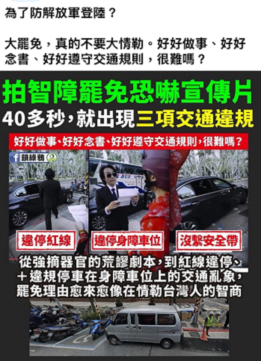 抹黒、栽贓嫁禍給他人,把人民當儍子嗎?請問一下這些綠色罷團,可以先遵守一下中華民國的交通法規嗎?從強摘器官的荒謬的劇本,影片中的黑頭車只短短出現40多秒,在仁愛路266巷口就出現三項交通違規。乘客未繫安全帶,頭手露出車窗;路口轉彎處紅線違停;更誇張的是,還違規停車在殘障車位上。