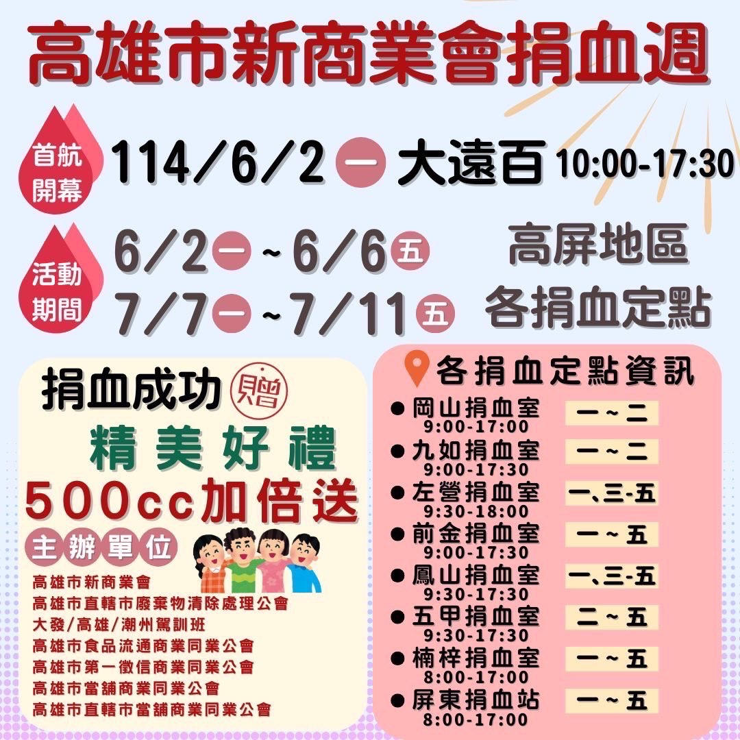 【本報記者陳明成高雄報導】「好血有你!情義相挺!」。高雄市新商業會發起的一一四年度聯合舉辦捐血活動,目標是13000袋,六月二日上午十時將在高雄大遠百廣場舉行「首航開幕式」正式開跑!捐250西西,即贈全聯百元禮券一張,或由高雄市食品流通商業同業公會提供的精美好禮,捐五百西西,則加倍送,送完為止。