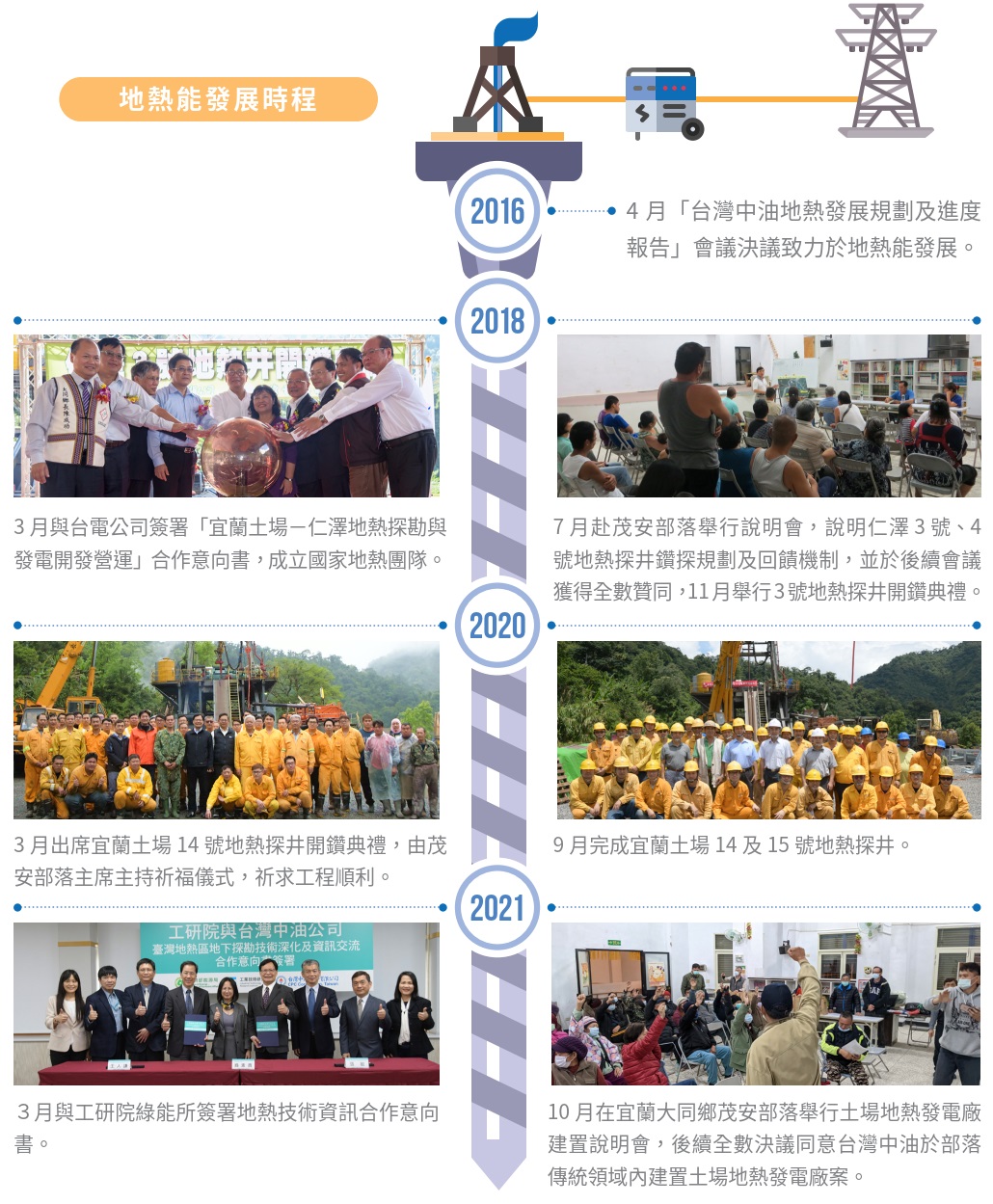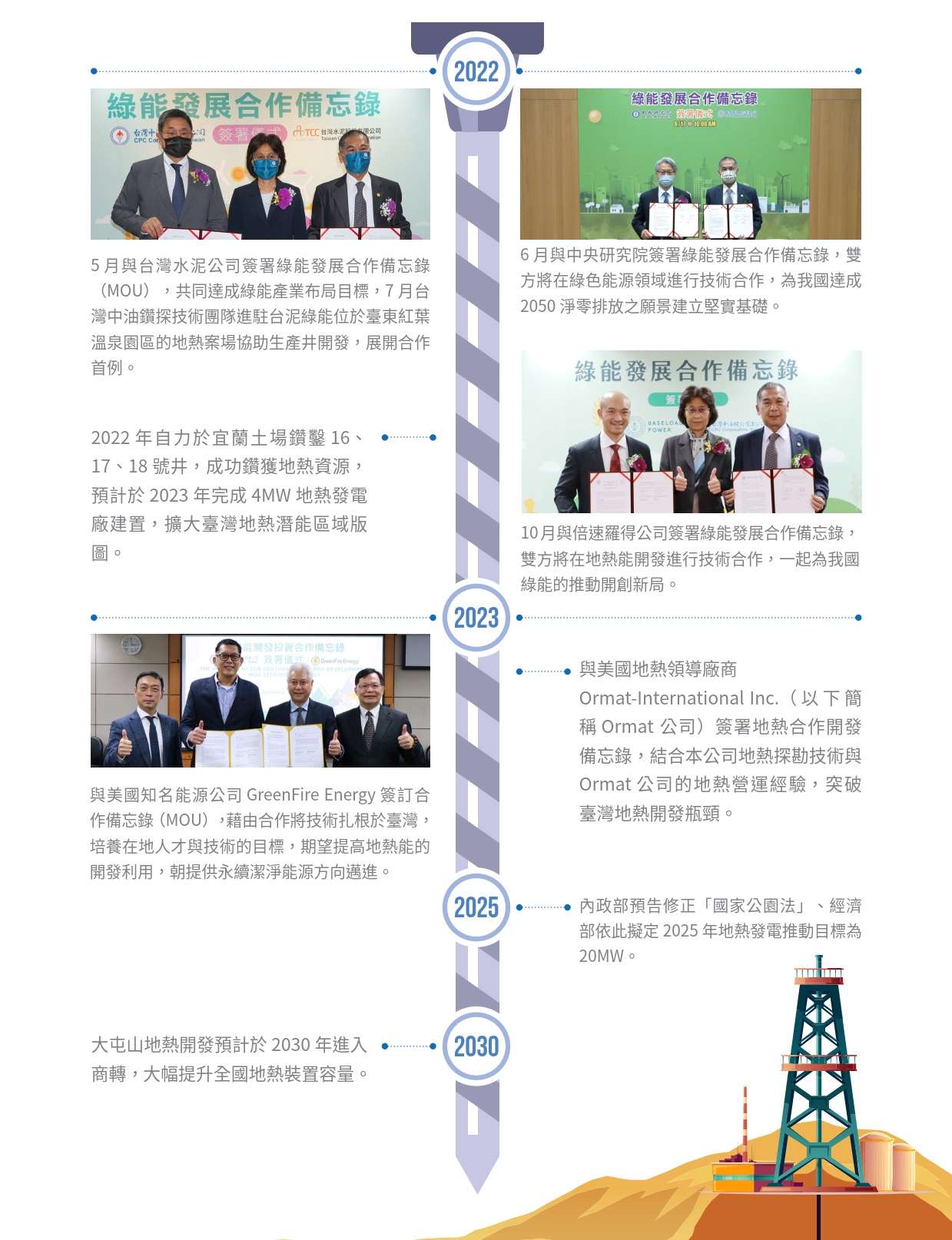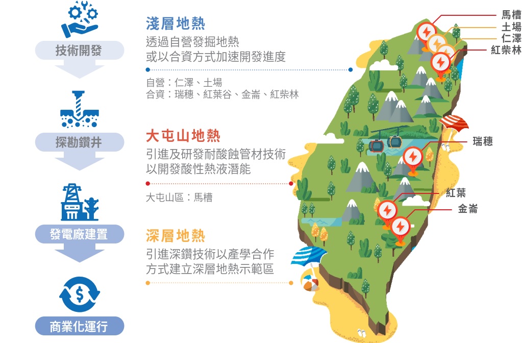 依據經濟部能源署2024.11.29日的地熱能推動報告,之前已經已併網 7.49MW ,2025年堆動目標為20.09MW(中油5.04MW、台電0.84MW、民閒13.85MW)至2030達到300MW。