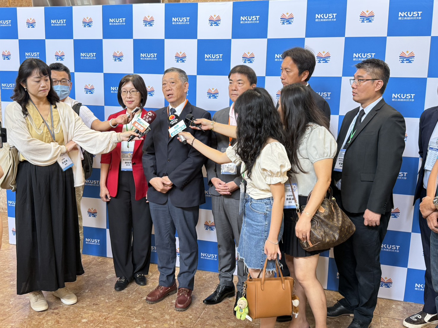 農業部漁業署主任秘書繆自昌(左四)與高科大副校長謝淑玲(左三)接受訪問