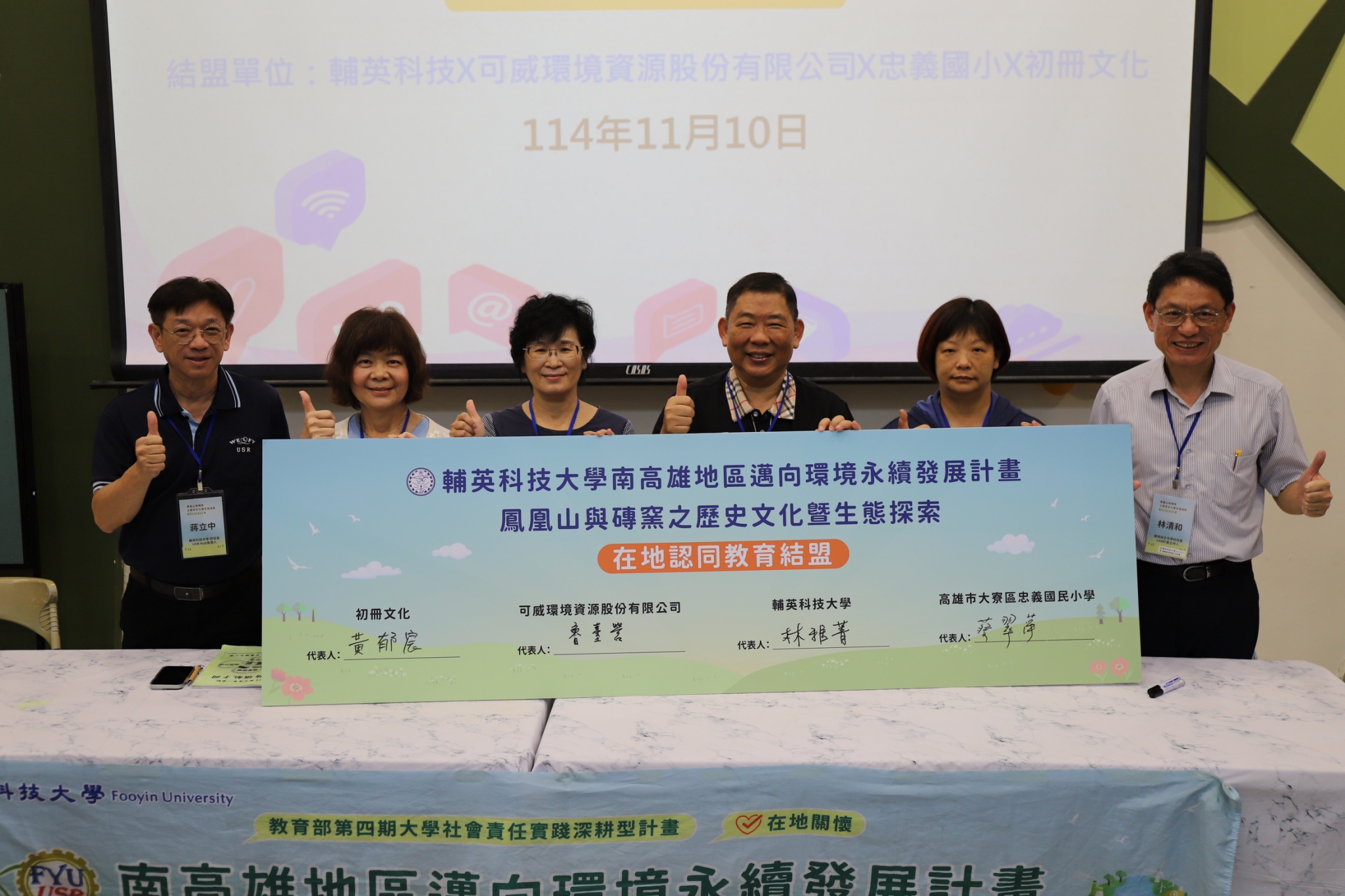 結盟儀式十日下午於忠義國小登場,由輔英科大、可威環境資源公司、忠義國小與初冊文化共同簽署,隨後由輔英學生及初冊文化擔任導覽員,領著忠義國小師生前往大寮磚窯廠及鳳凰山,進行文化與生態導覽,透過教育與行動的結合,讓師生了解在地自然與人文特色。