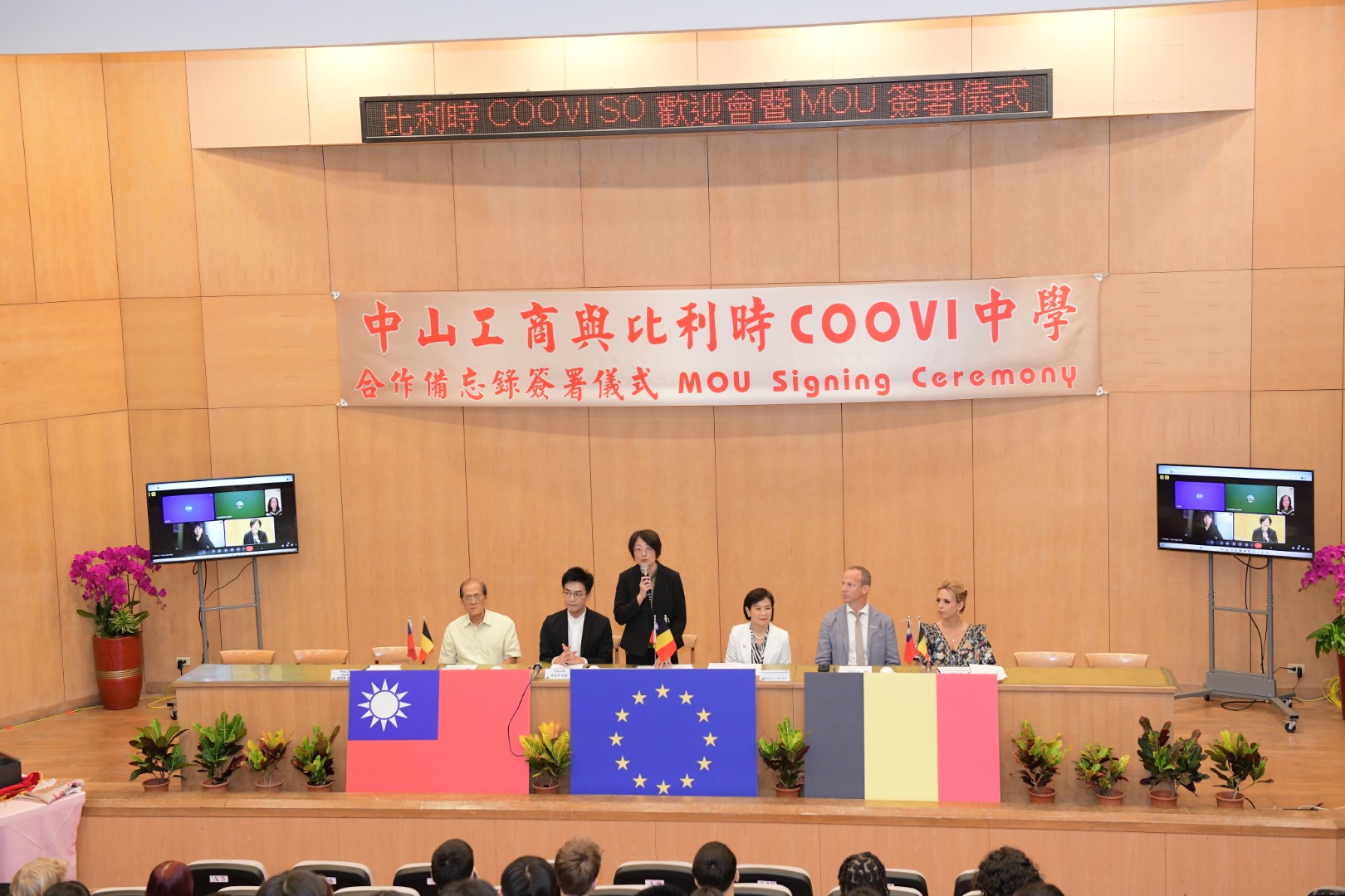 中山工商14日上午於「比利時歡迎會暨MOU簽署儀式」六和敬大樓一樓講堂舉行。比利時COOVI中學包括技術顧問兼協調員Olivier Dumoulin與教學 協調主任Laura Vandebroeck等師生共十人。中山工商由陳國清董事長率李昱平校長、國際教育處張佳琪主任、師生代表一同出席。比利時台北辦事處法蘭德斯經貿組組長吳良鈺及教育部國教署原民特教組林淑敏副組長到場致詞,駐比利時代表處李彥儀組長以線上見證簽約儀式。