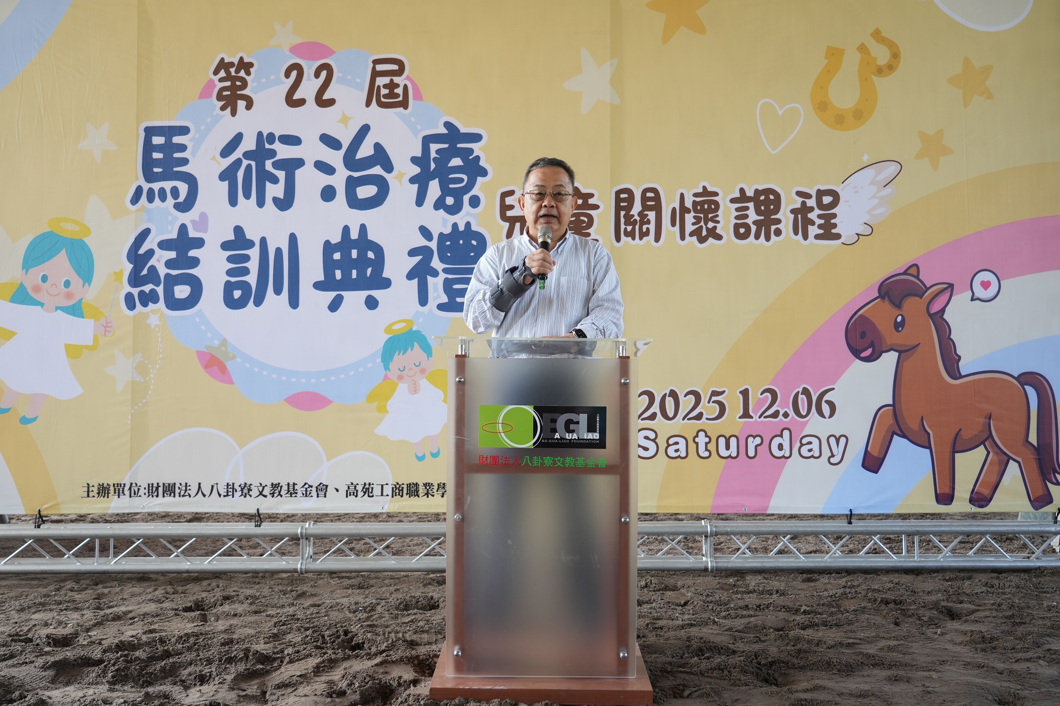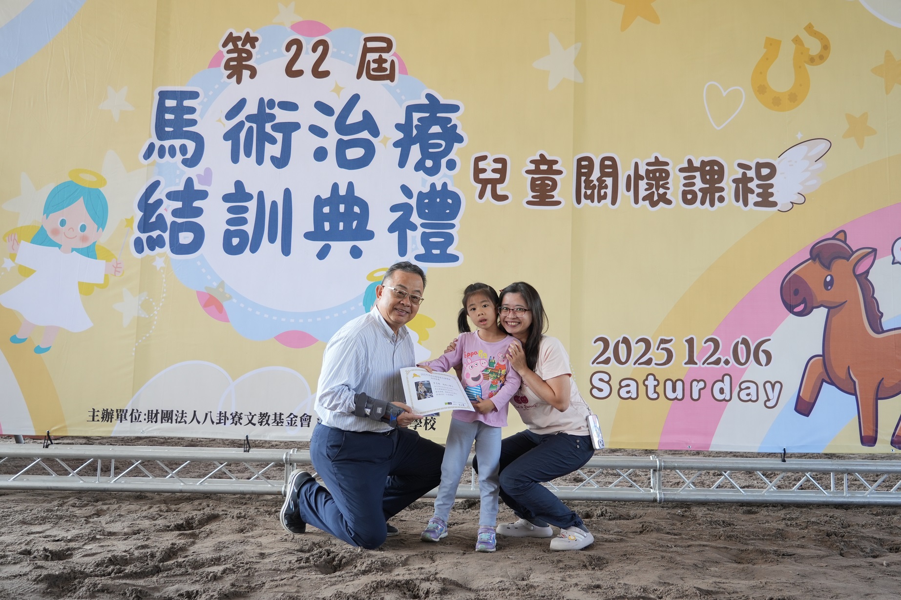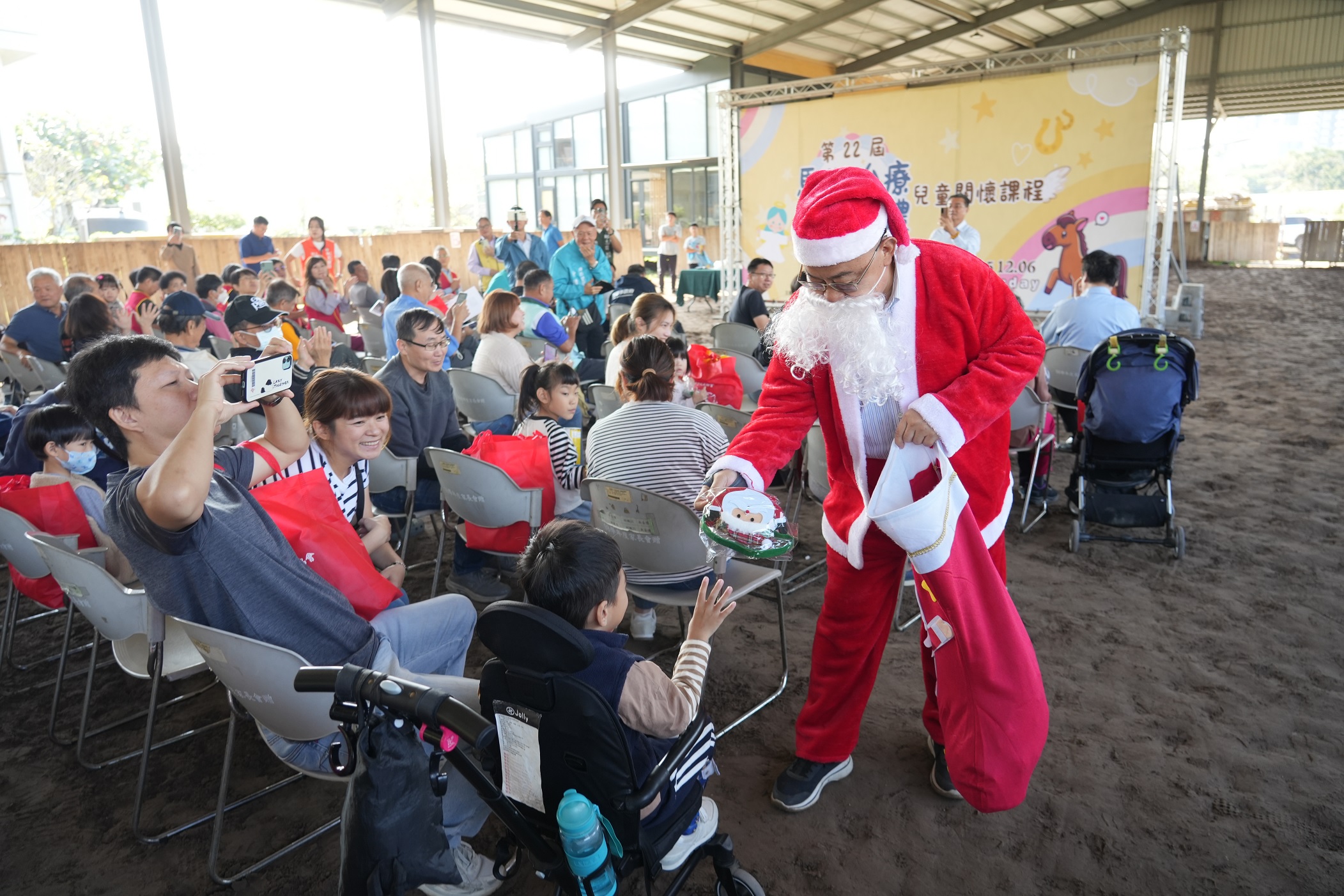 為期3個月的關懷兒童馬術治療結訓典禮,上午在橋頭馬術中心舉行結訓典禮,本期共15名小朋友參加,都在家長陪同下出席,高雄市政府李懷仁副市長、侯尊堯局長和眾多好朋友到場支持,主辦單位八卦寮文教基金會董事長余政憲扮聖誕老人分享成果,他表示,基金會舉辦相關治療已22年,讓超過200位慢飛天使接觸馬術治療,見證孩子奇蹟般的成長,就是堅持下去的動力。