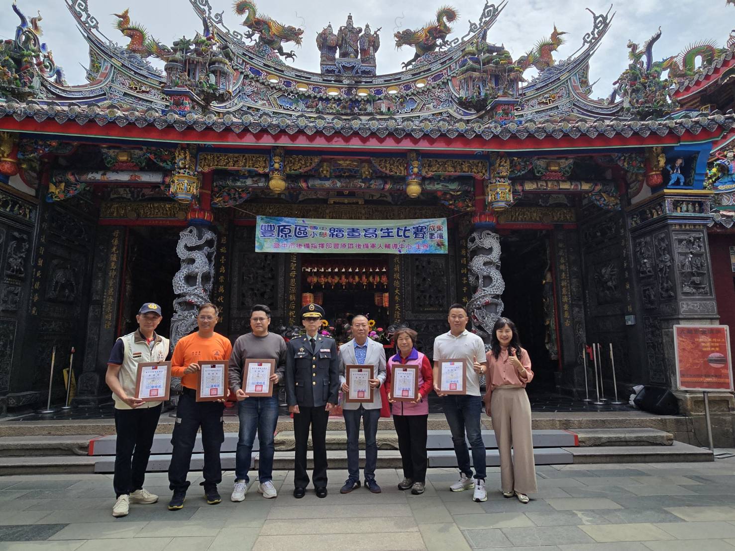 【本報記者陳靖天台中報導】115年度臺中市後備指揮部豐原區後備軍人輔導中心,本月8(日)舉行的「豐原區國中、小學繪畫寫生比賽」,經過評審選出豐田國小黃聿璿、翁子國小張嘉紜、南陽國小王珞合分別勇奪國小組高中低組別第一名,豐原區後備軍人輔導中心21日下午特別在豐原慈濟宮廟埕盛大舉行頒獎典禮,表揚各組前三名優秀小畫家。