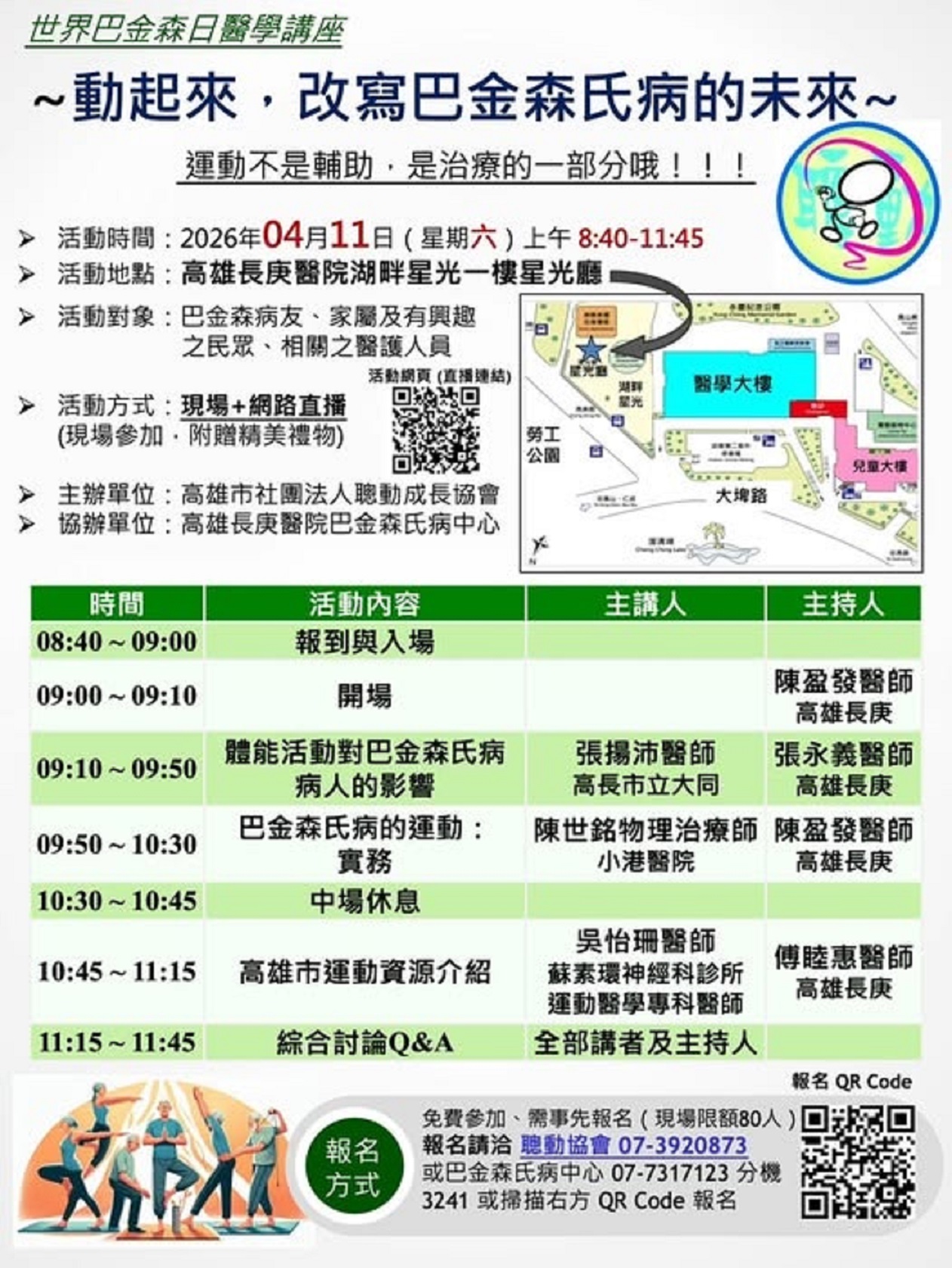 為了迎接世界巴金森日,聰動成長協會與高雄長庚醫院特別舉辦醫學講座─動起來!改寫巴金森氏病的未來,邀請病友家屬及醫護人員共襄盛舉,報名十分躍踴躍,現場名額已滿,只能轉向報名視訊。
