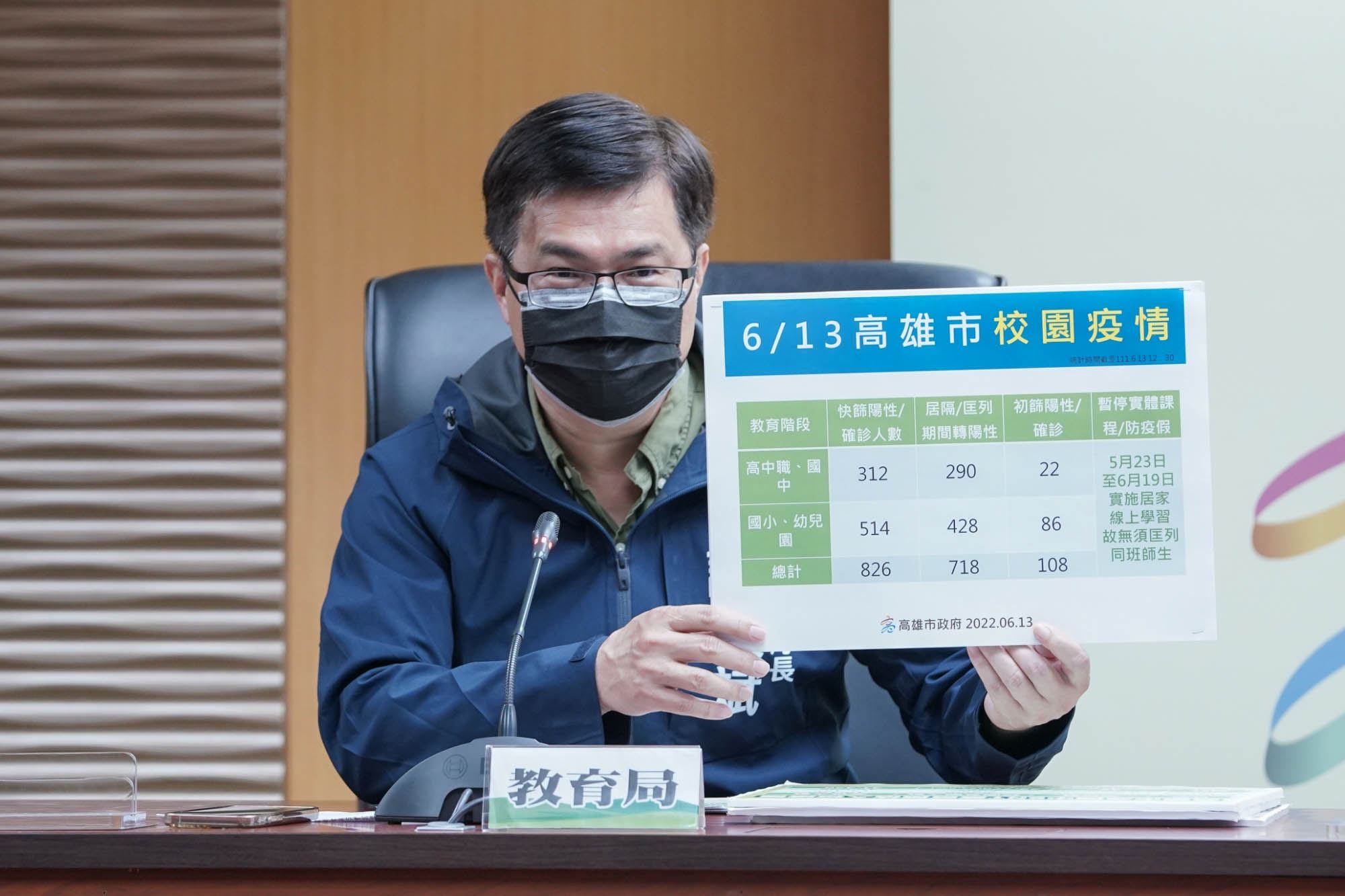 有關校園疫情,教育局長謝文斌說明,高中以下校園確診人數312人,國小幼兒園514人,總計染疫人數826人;針對國高中第三劑疫苗施打,將在本周持續安排入校接種,請接種學生攜帶健保卡及接種意願書,依通知接種時間建議回校施打;五專三年級以下、國小第2劑疫苗,亦會安排校園接種。另外在醫療量能部分,衛生局長黃志中說明,目前專責及負壓隔離病床總床數2,305床,空床數1,121床,空床率48.6%。加強型防疫旅館484床,空床數410床,空床率84.7%。接受居家照護69,335人,占97.8%,住院則有1,144人,占1.6%。