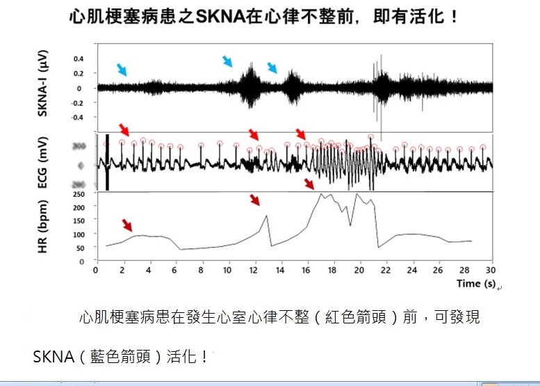 其中一名60歲急性心肌梗塞男性病患接受交感神經檢測時,影像可見心室心律不整,而在心律不整前,交感神經出現異常的活化;病患緊急接受心肌梗塞治療後,其交感神經活性馬上下降,心室心律不整也立刻減少!