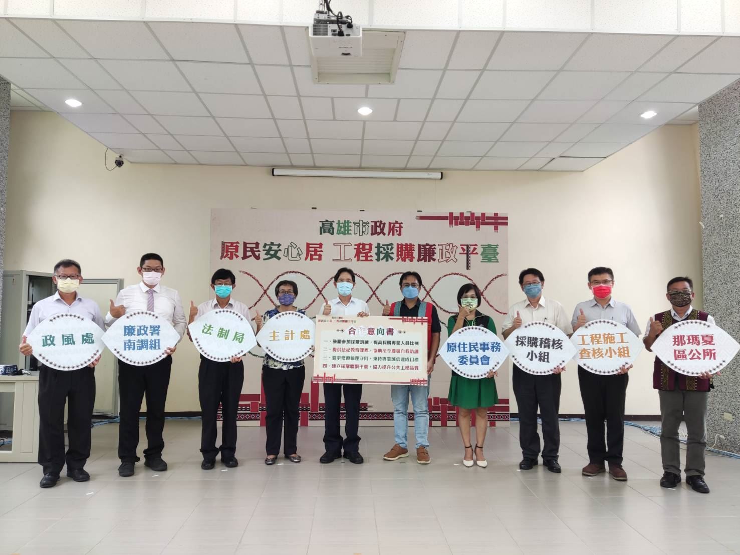 市府政風處、主計處、法制局、研考會(工程施工查核小組)、工務局(採購稽核小組)、原住民事務委員會及法務部廉政署南部地區調查組等機關,與那瑪夏區公所一同建立「工程採購聯繫平臺」,並透過簽署合作意向書,藉此暢通區公所與各機關的聯繫溝通管道,共同提升公共工程品質,攜手打造優質居住環境,達成原民安心居的願景。