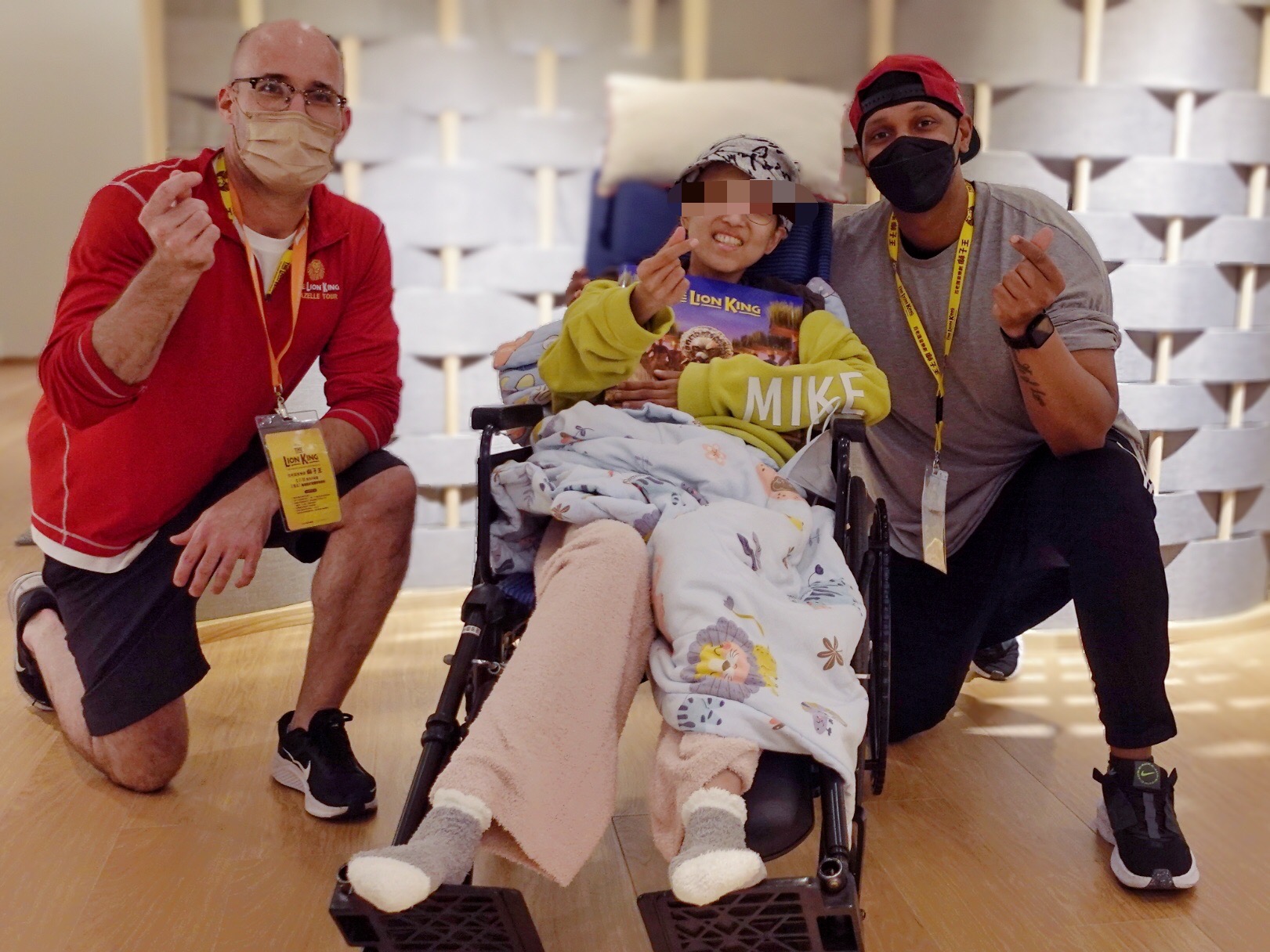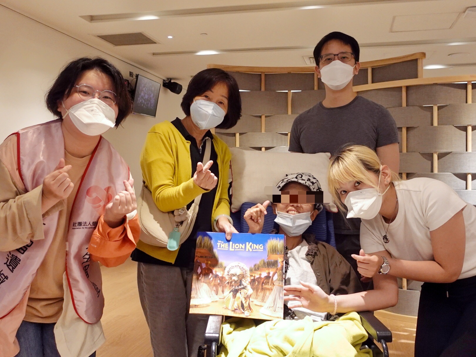 佳佳(坐輪椅者)在巫承哲醫師(右2)、媽媽(左2)、愛的延續公益協會人員(左)陪同下,赴衛武營觀賞《獅子王》歌劇。